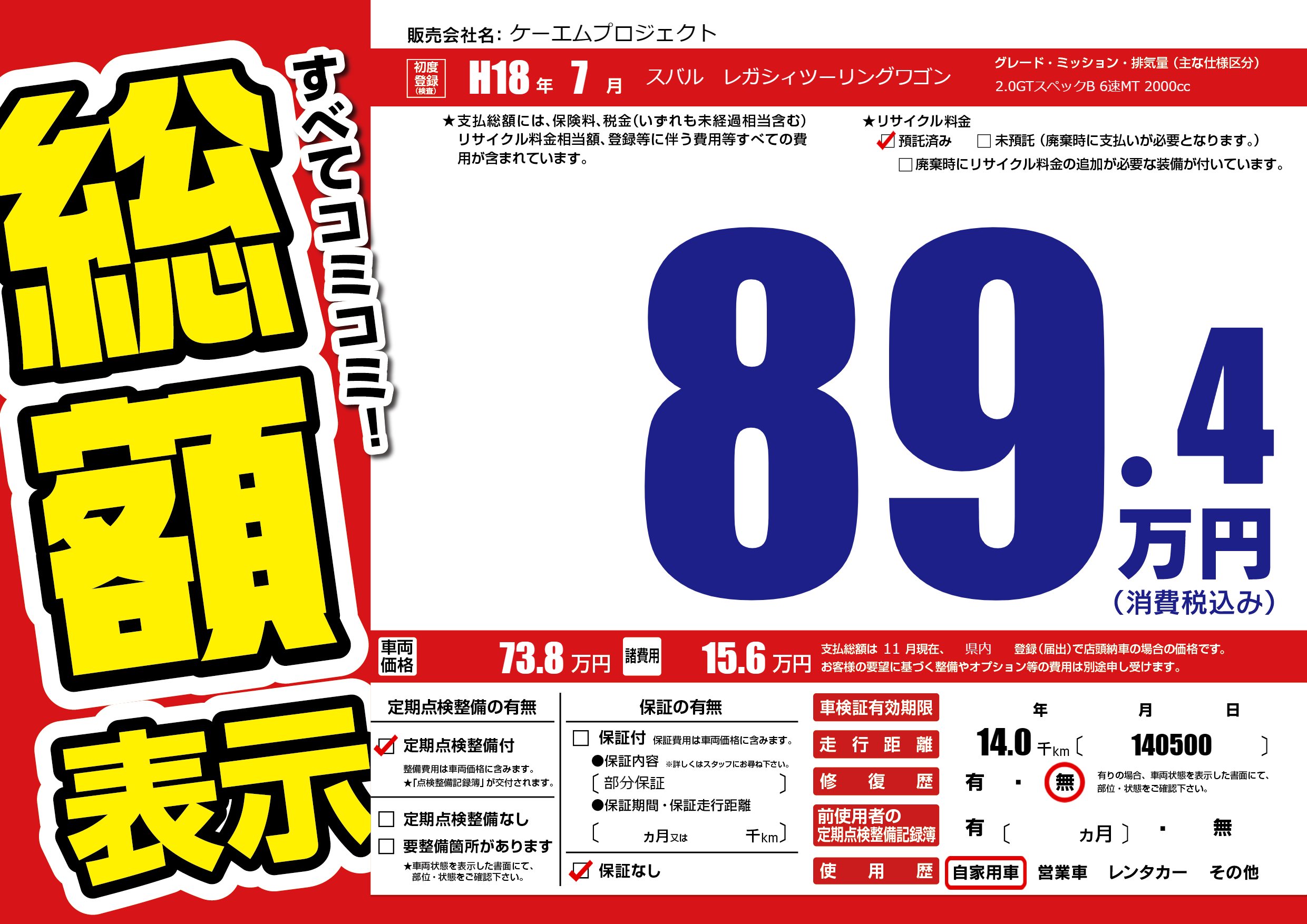 | 車名 | スバル レガシィツーリングワゴン | グレード ミッション 排気量 |