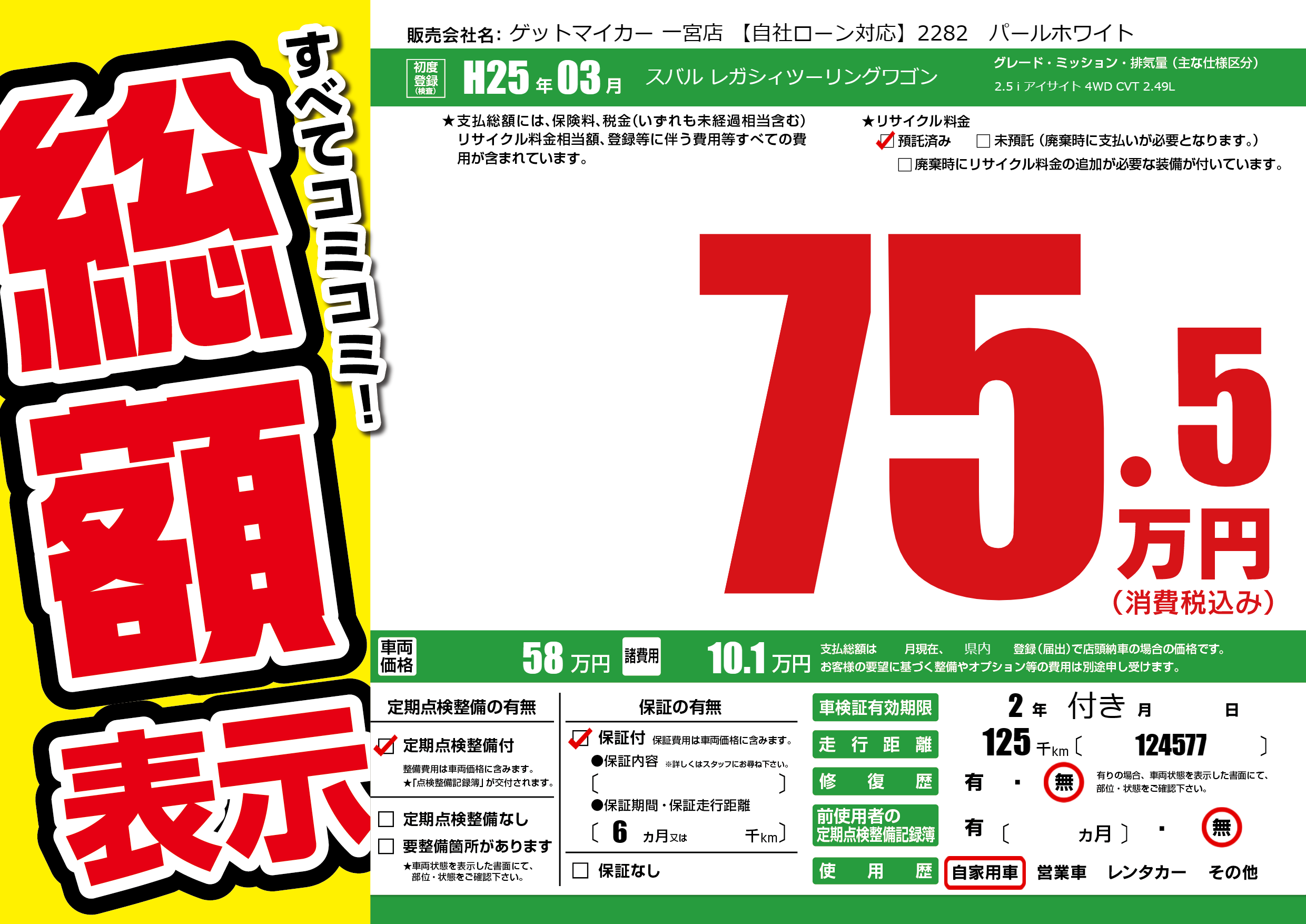 | 車名 | スバル レガシィツーリングワゴン | グレード ミッション 排気量 |