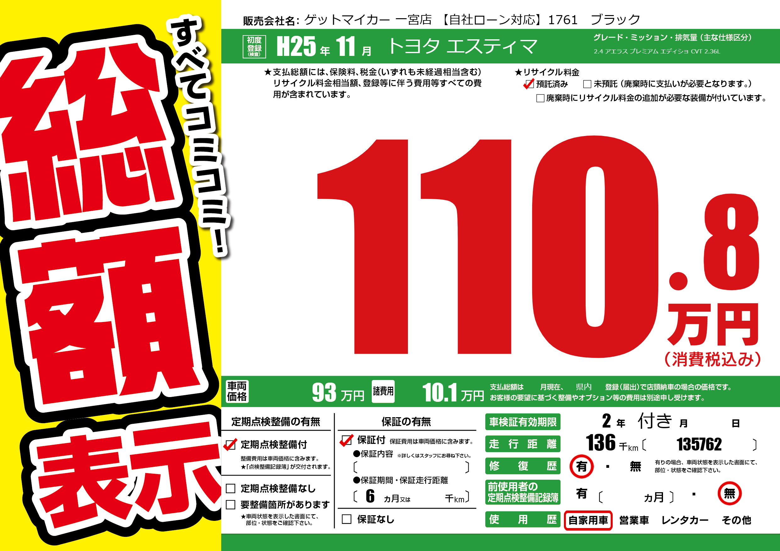 | 車名 | トヨタ エスティマ | グレード ミッション 排気量 |