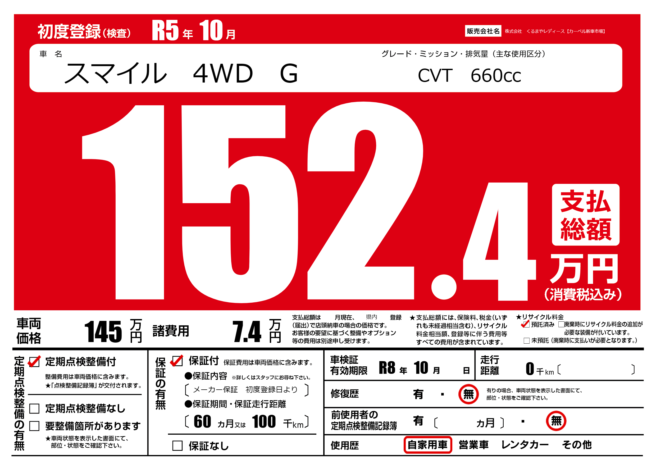 | 車名 | スマイル 4WD G | グレード ミッション 排気量 |
