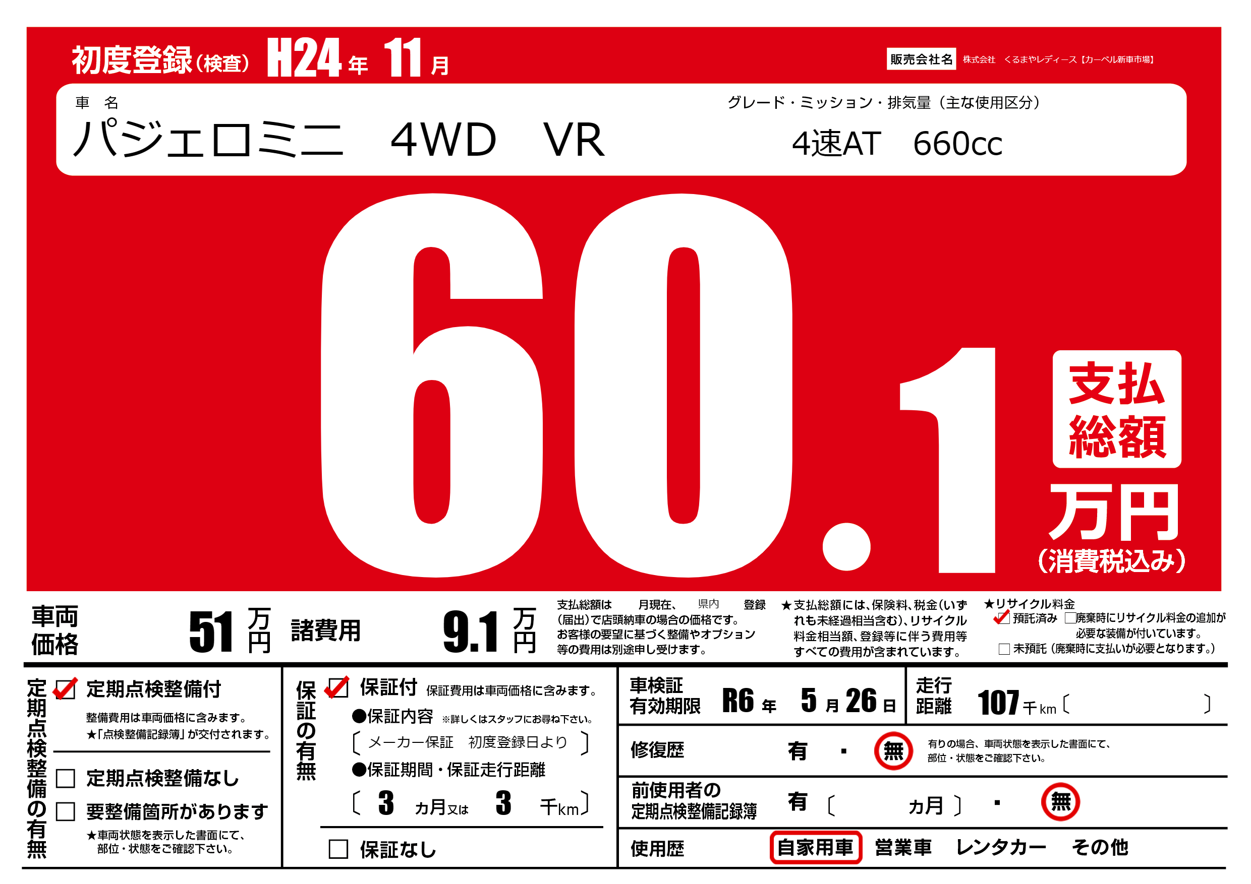 | 車名 | パジェロミニ 4WD VR | グレード ミッション 排気量 |