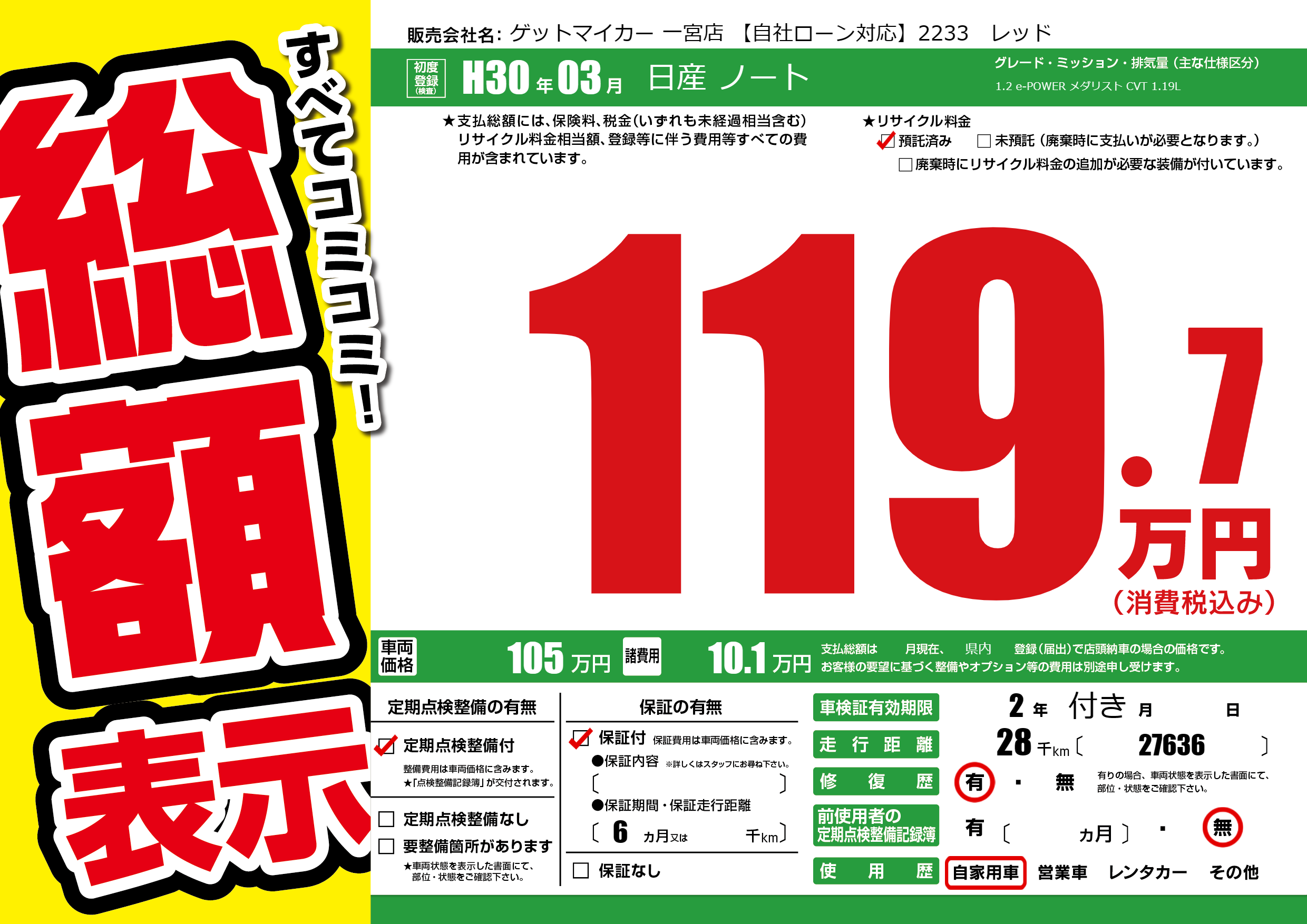 | 車名 | 日産 ノート | グレード ミッション 排気量 |