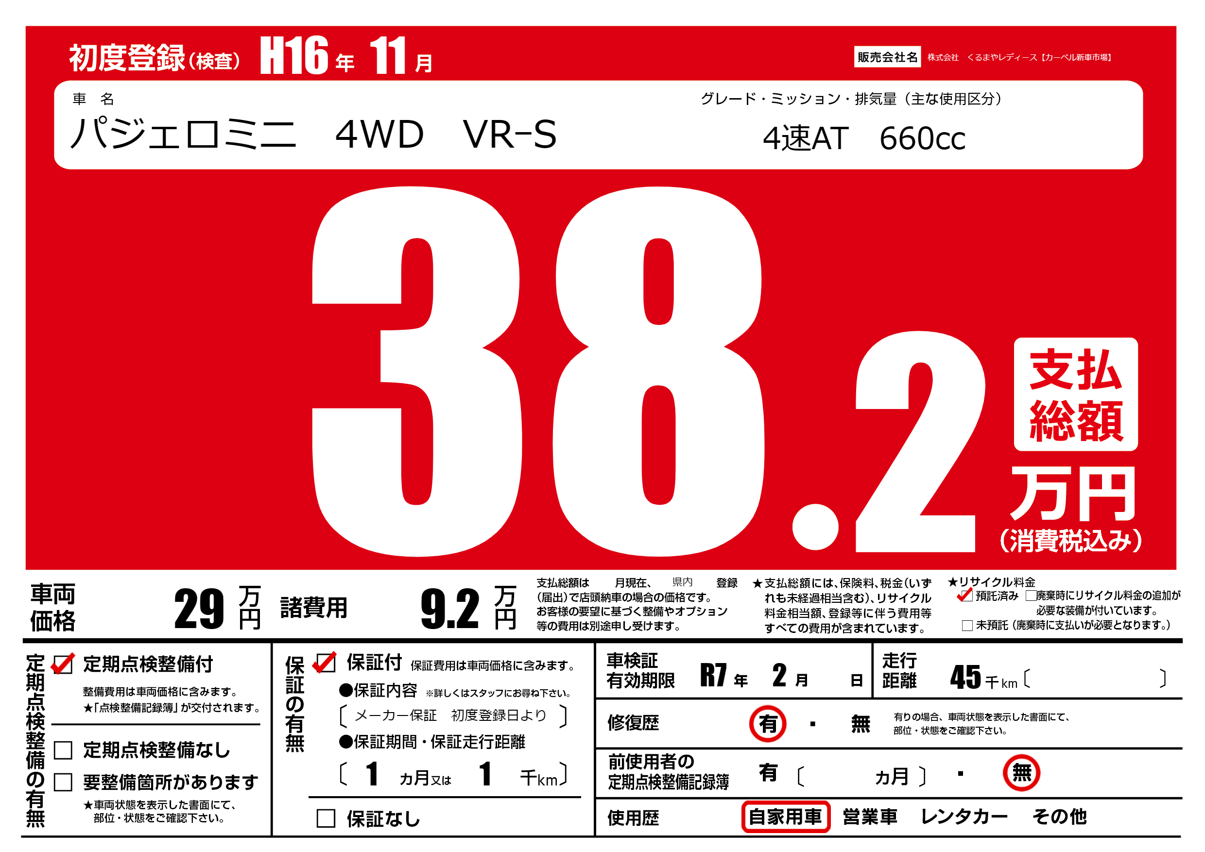 | 車名 | パジェロミニ 4WD VRーS | グレード ミッション 排気量 |