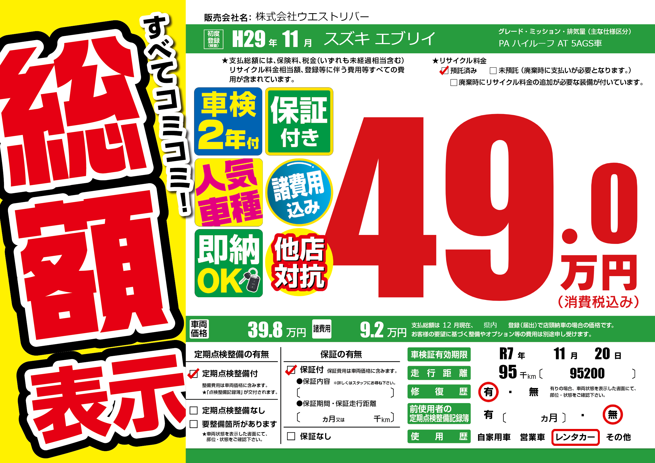 | 走行キロ | 9.5万km | 初年度登録 | H29年11月 |