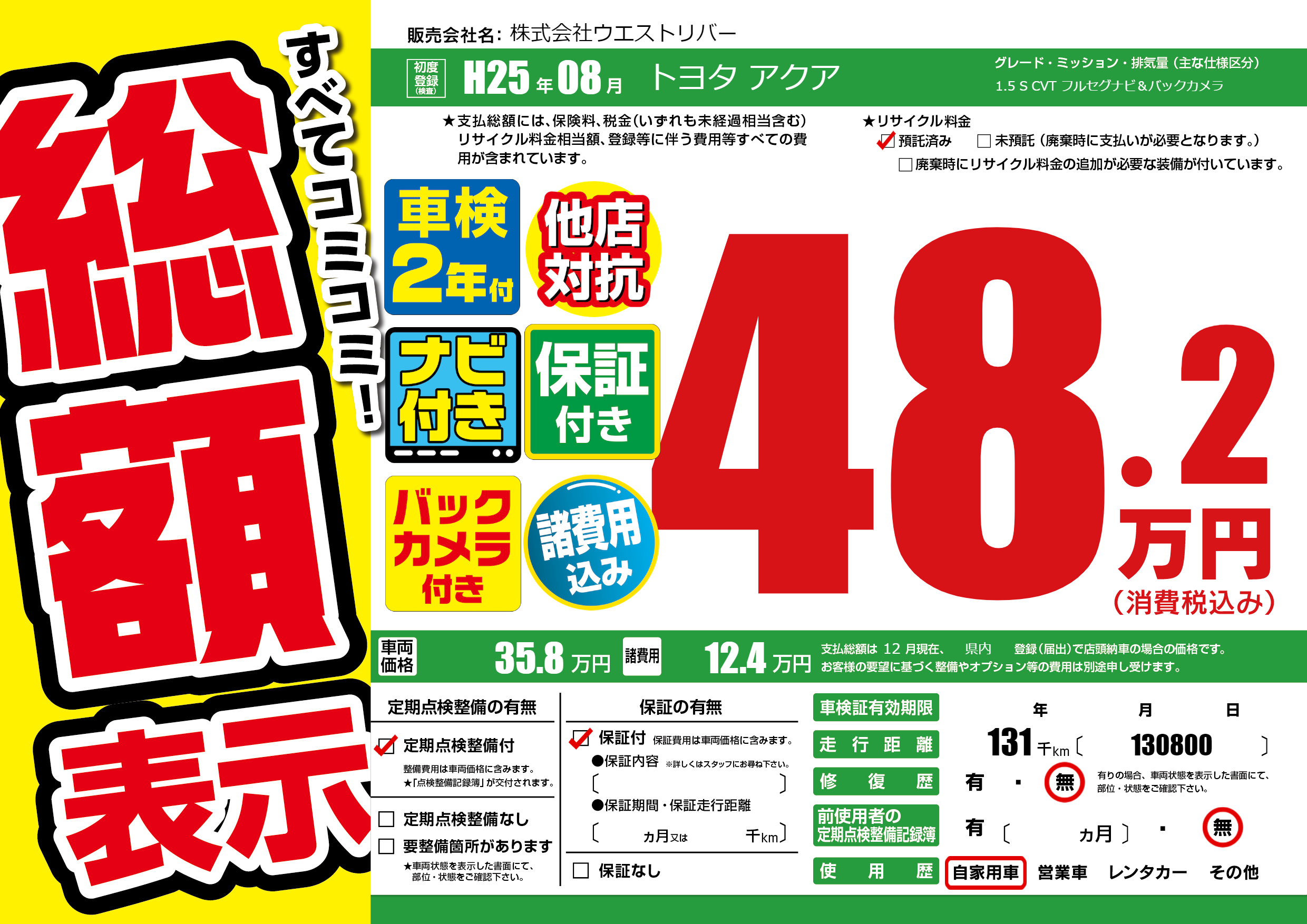 | 走行キロ | 13.1万km | 初年度登録 | H25年08月 |