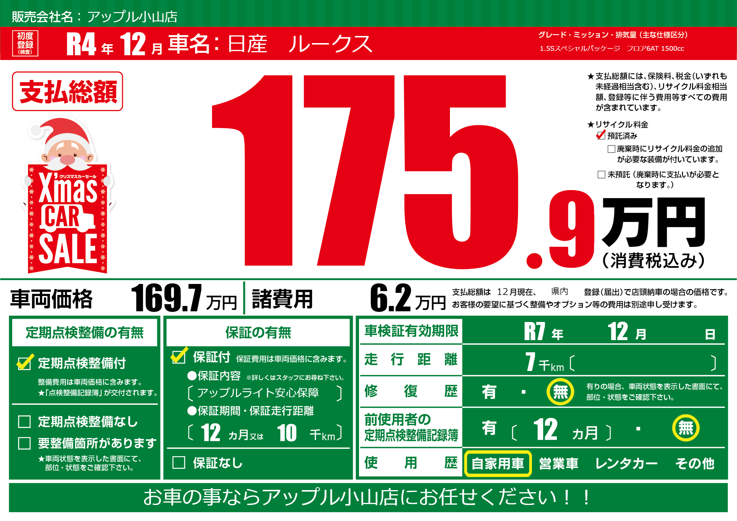 | 走行キロ | 0.7万km | 初年度登録 | R4年12月 |