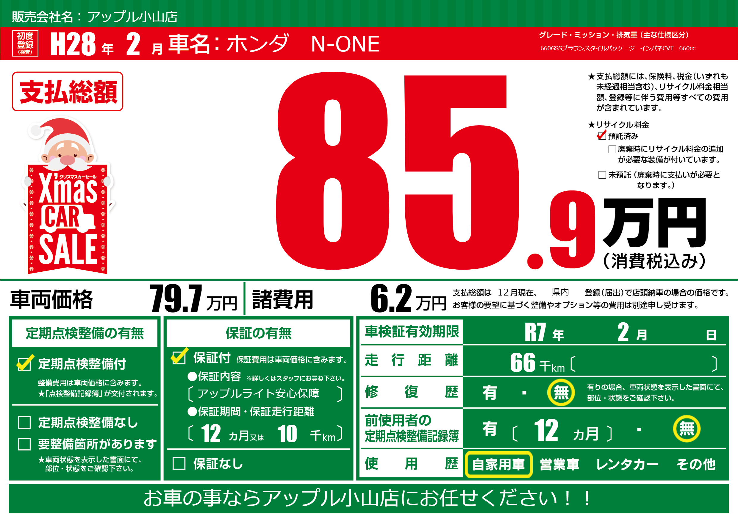 | 車検制限 | R7年 2月 - 日 | ||