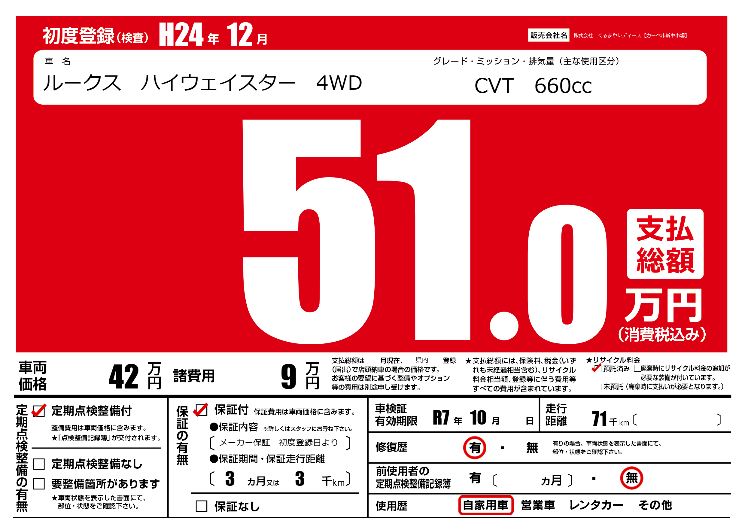 | 走行キロ | 7.1万km | 初年度登録 | H24年12月 |