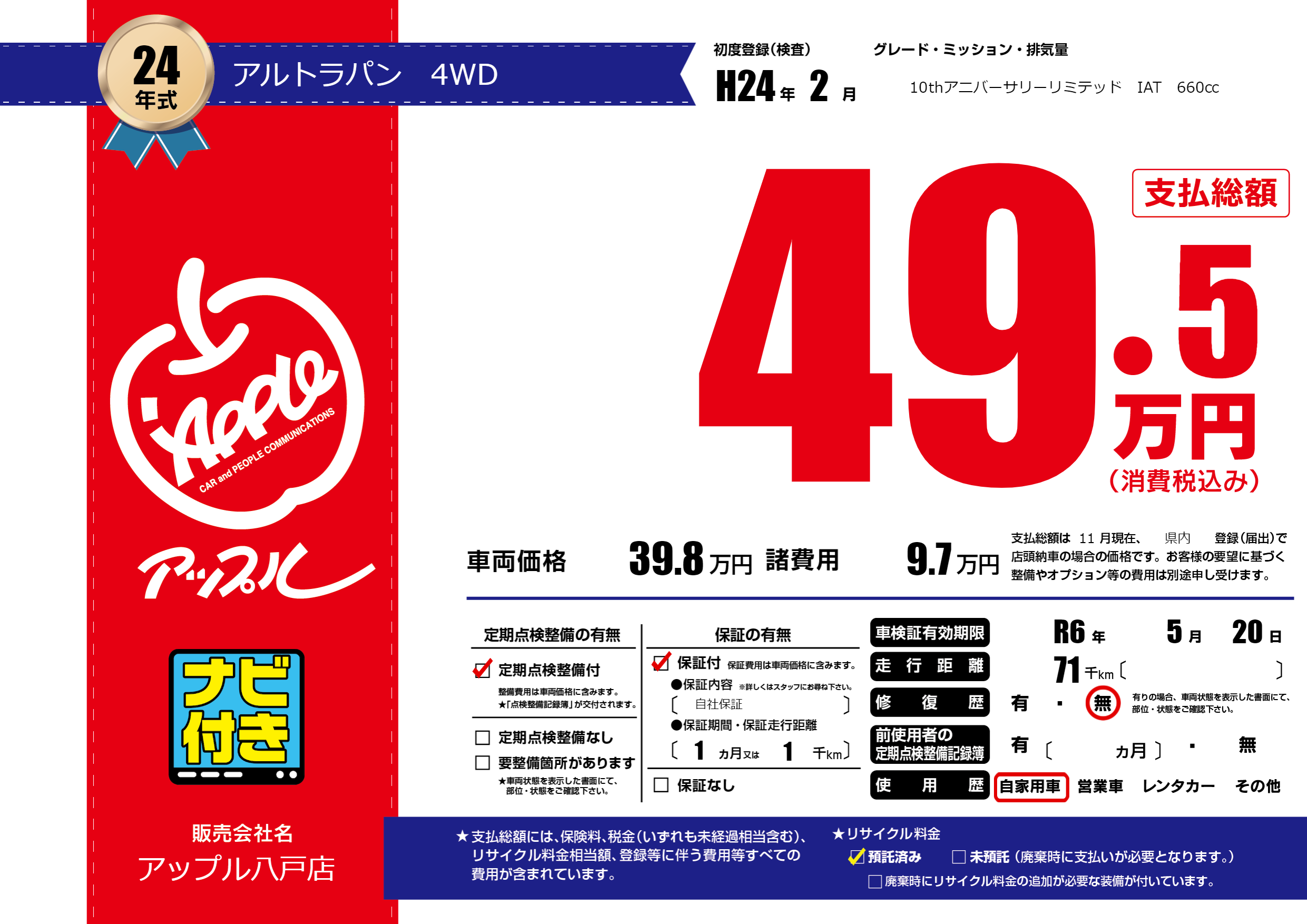 なし | 車検制限 | R6年5月20月 |