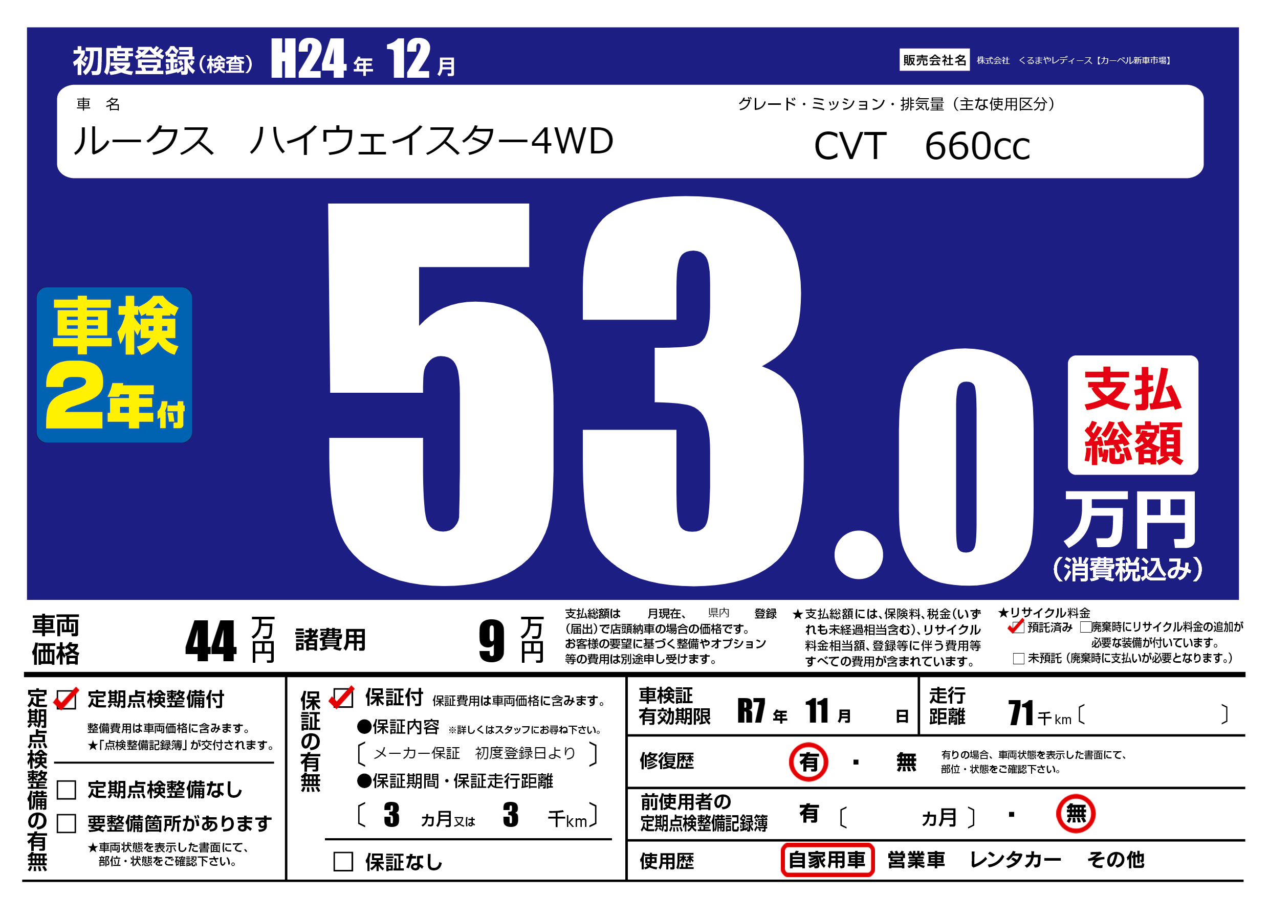 | 走行キロ | 7.1万km | 初年度登録 | H24年12月 |