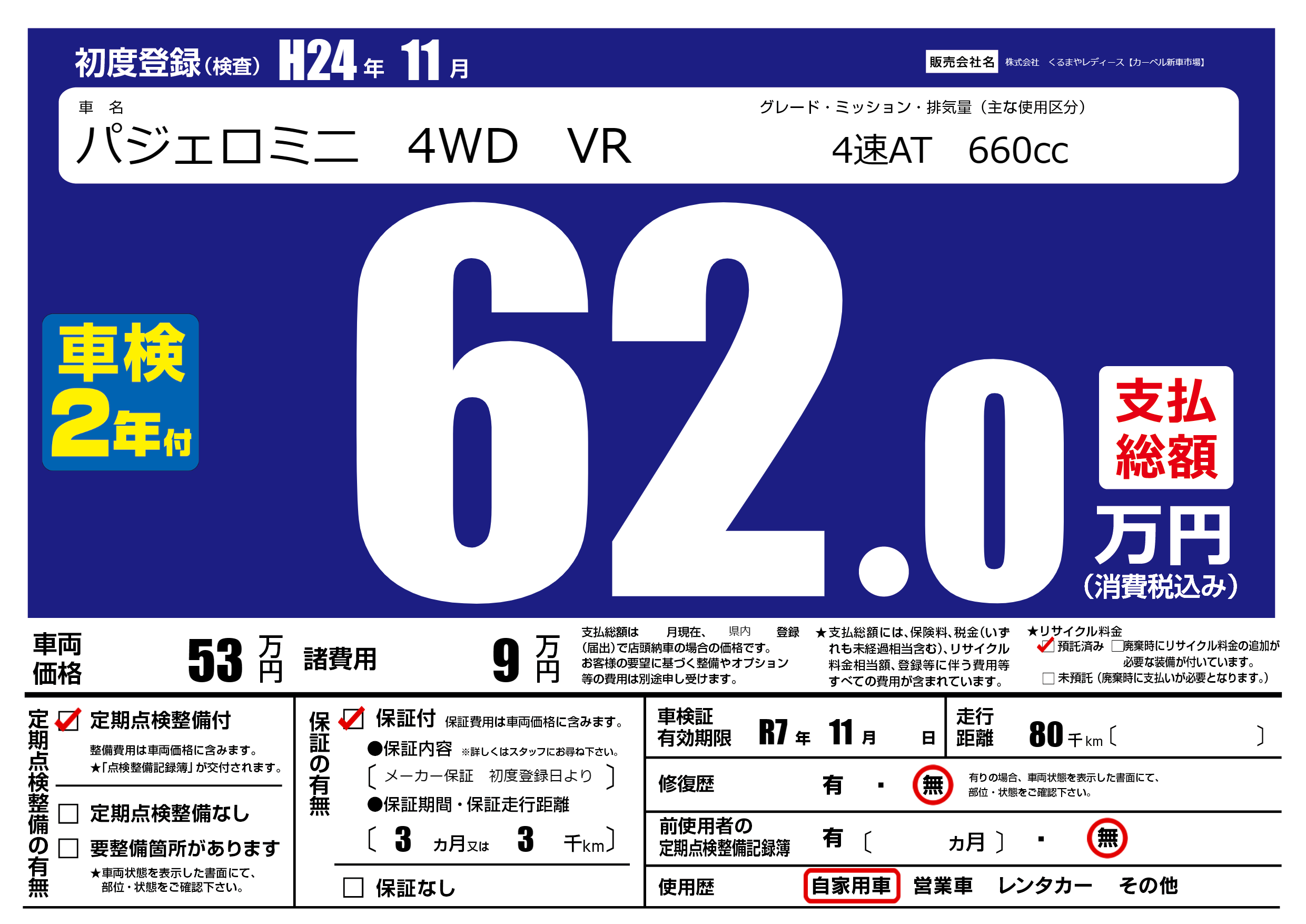 | 車名 | パジェロミニ 4WD VR | グレード ミッション 排気量 |