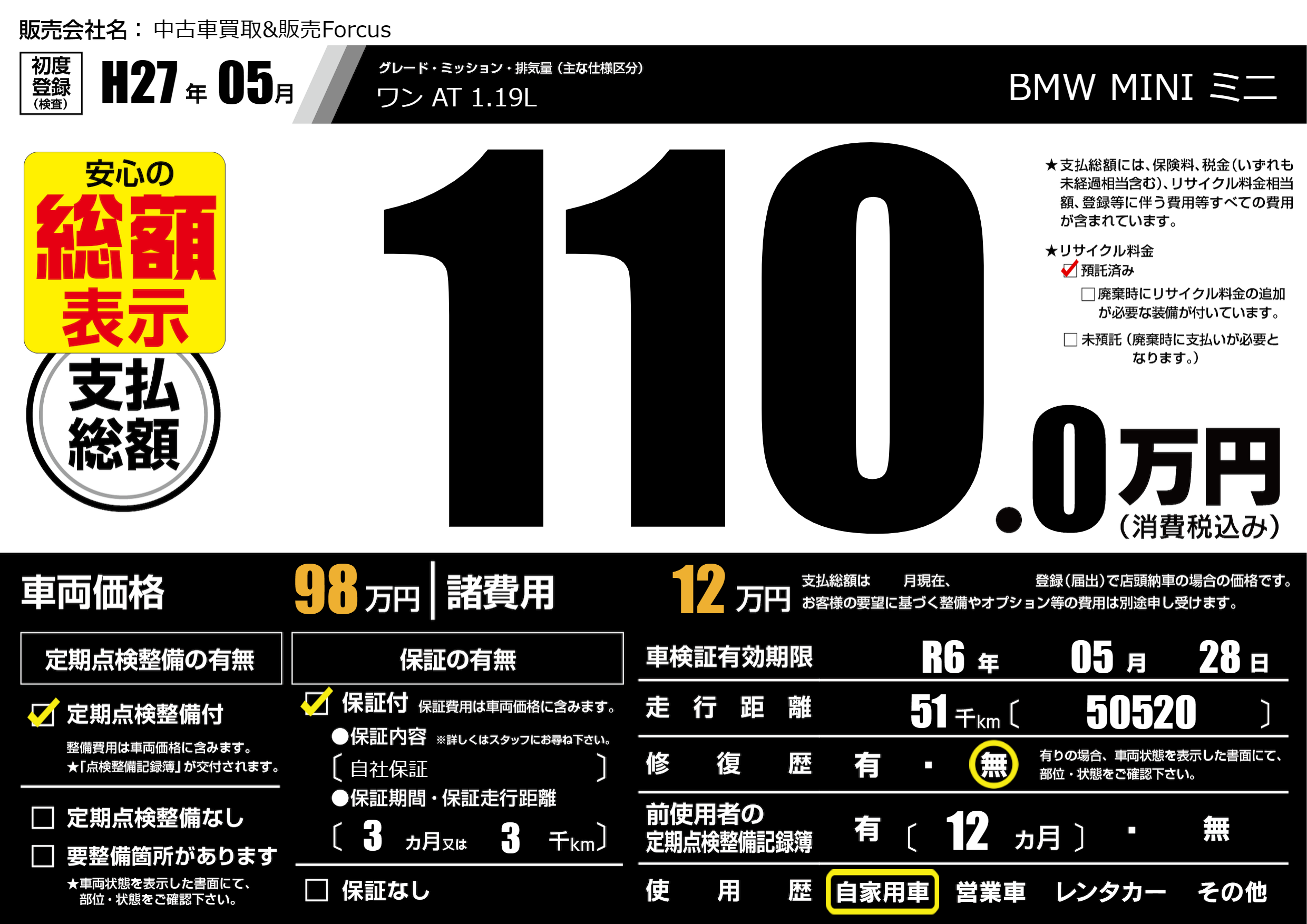 | 車名 | BMW MINI ミニ | グレード ミッション 排気量 |