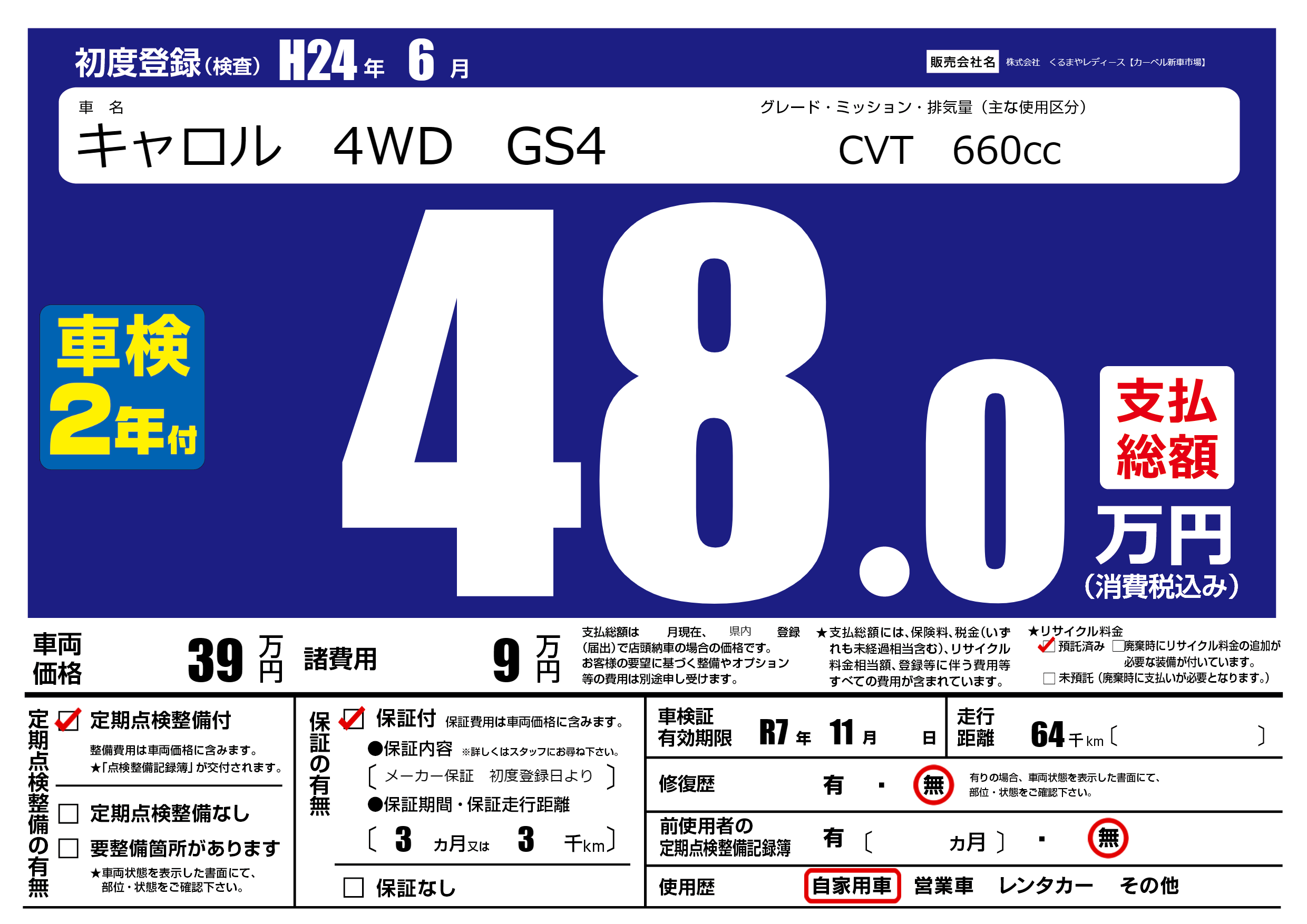 | 車名 | キャロル 4WD GS4 | グレード ミッション 排気量 |