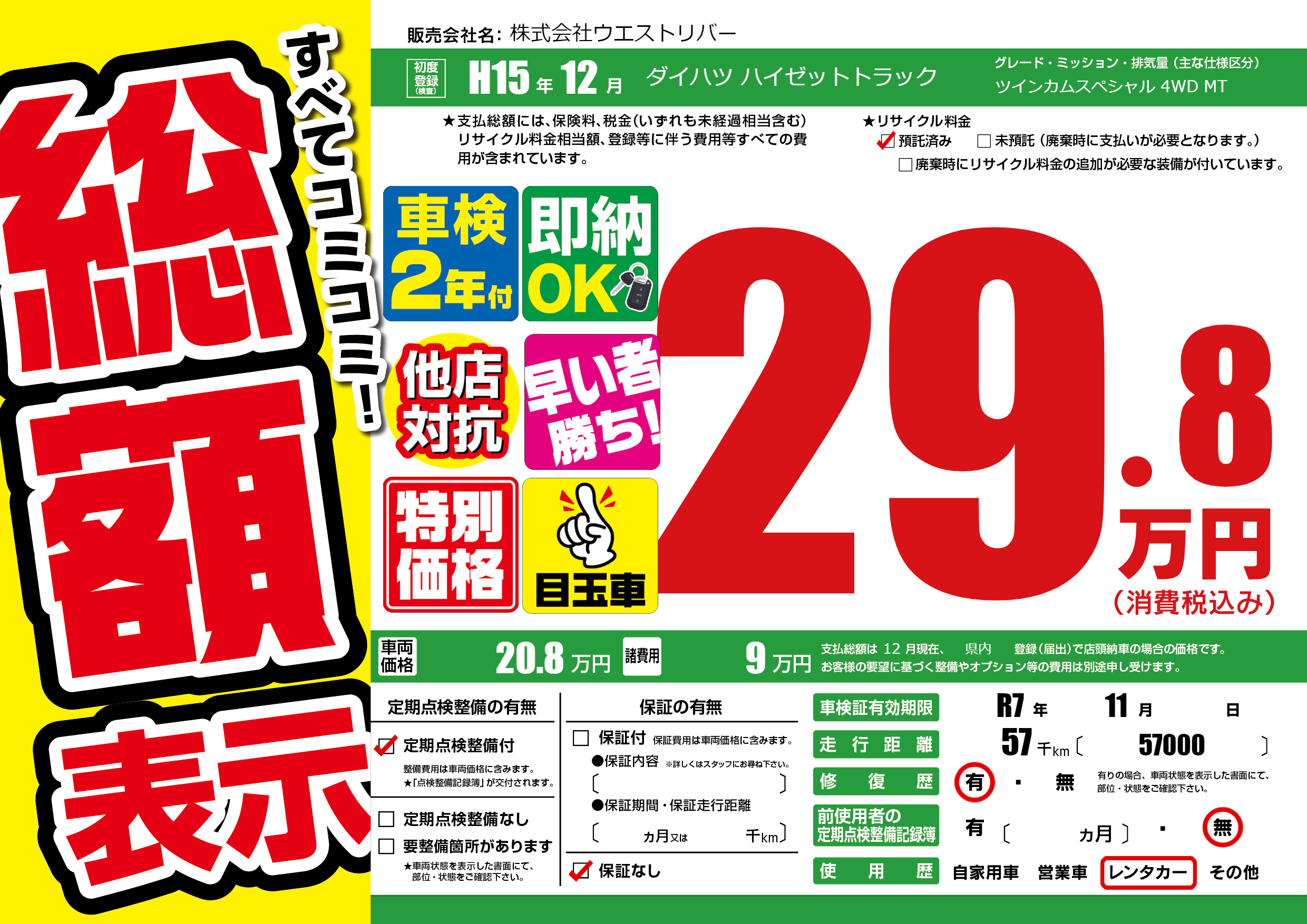 | 走行キロ | 5.7万km | 初年度登録 | H15年12月 |