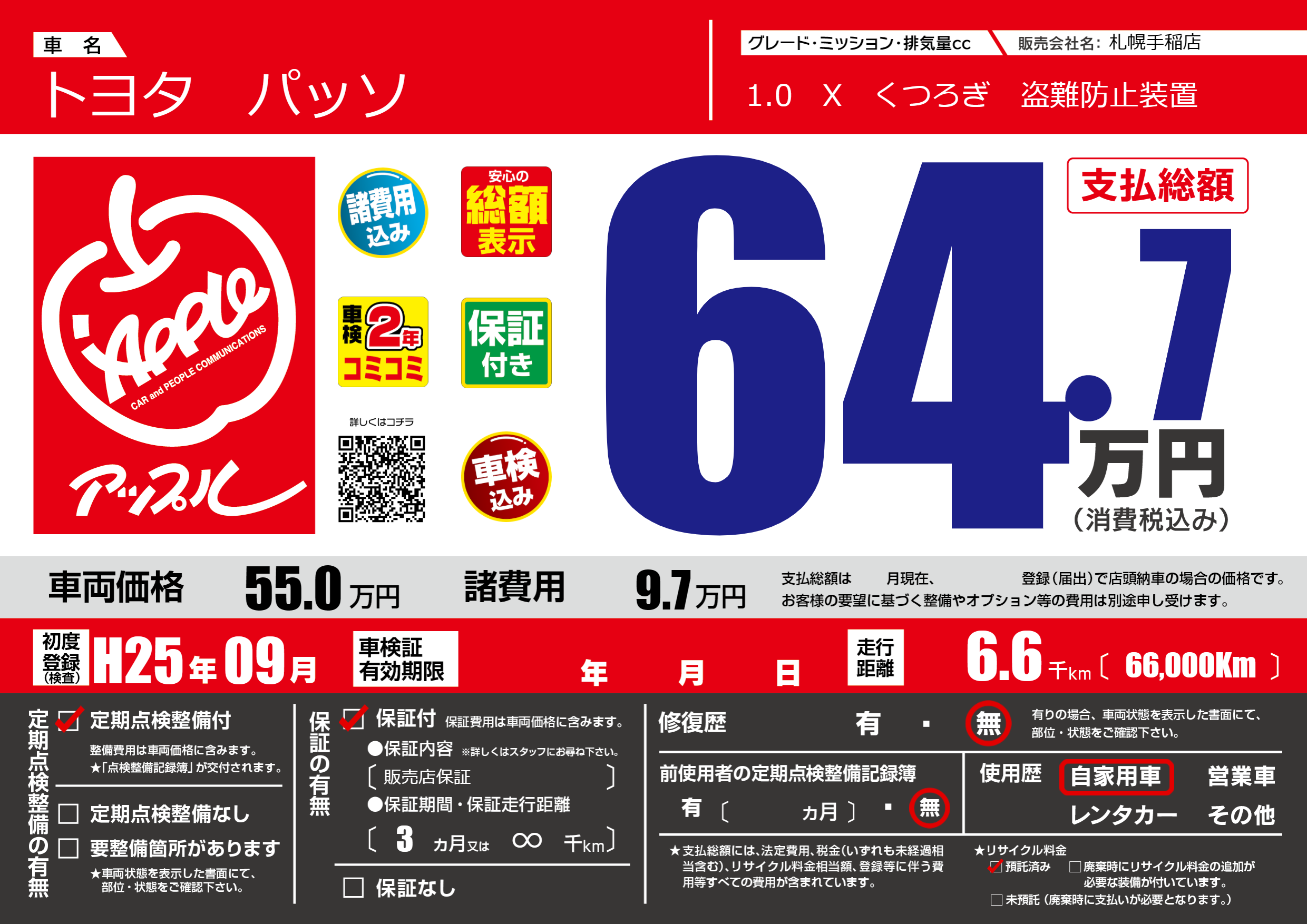 | 車名 | トヨタ パッソ | グレード ミッション 排気量 |