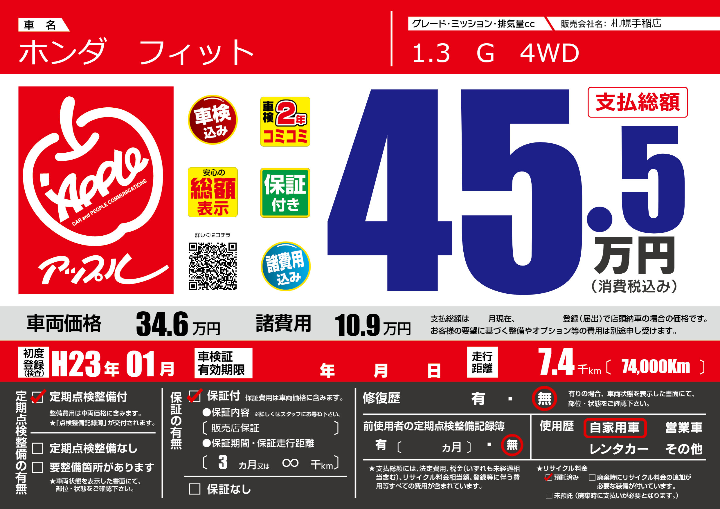 保証なし 保証内容(販売店保証) 3ヶ月または(∞)千kmまで |