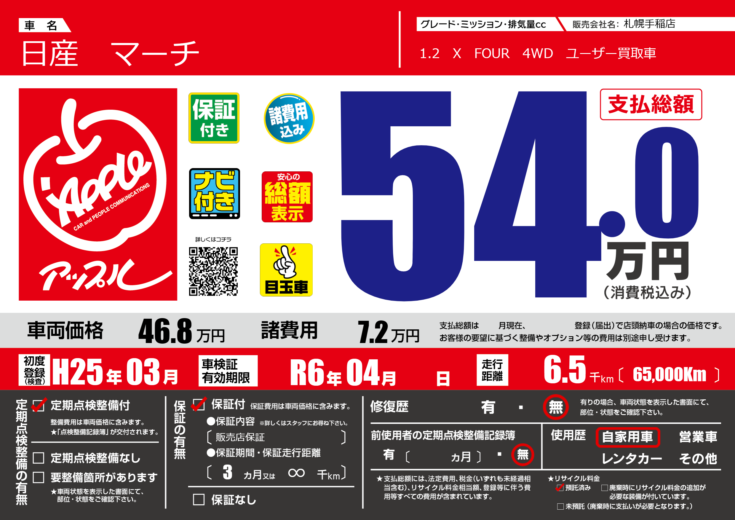 | 車名 | 日産 マーチ | グレード ミッション 排気量 |