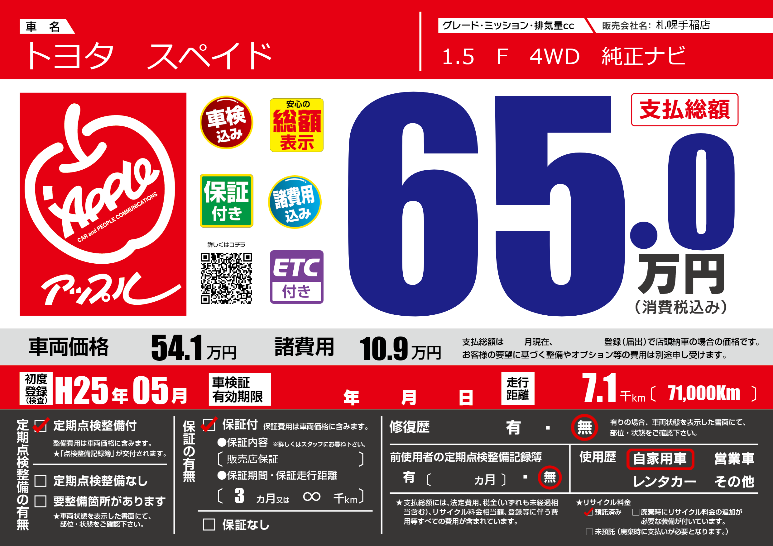 | 車名 | トヨタ スペイド | グレード ミッション 排気量 |