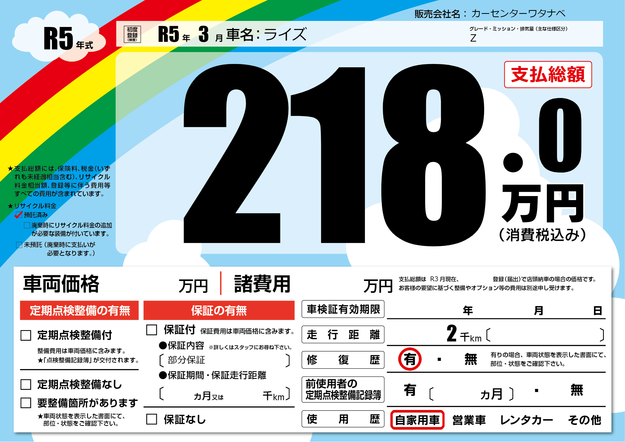 | 走行キロ | 0.2万km | 初年度登録 | R5年3月 |