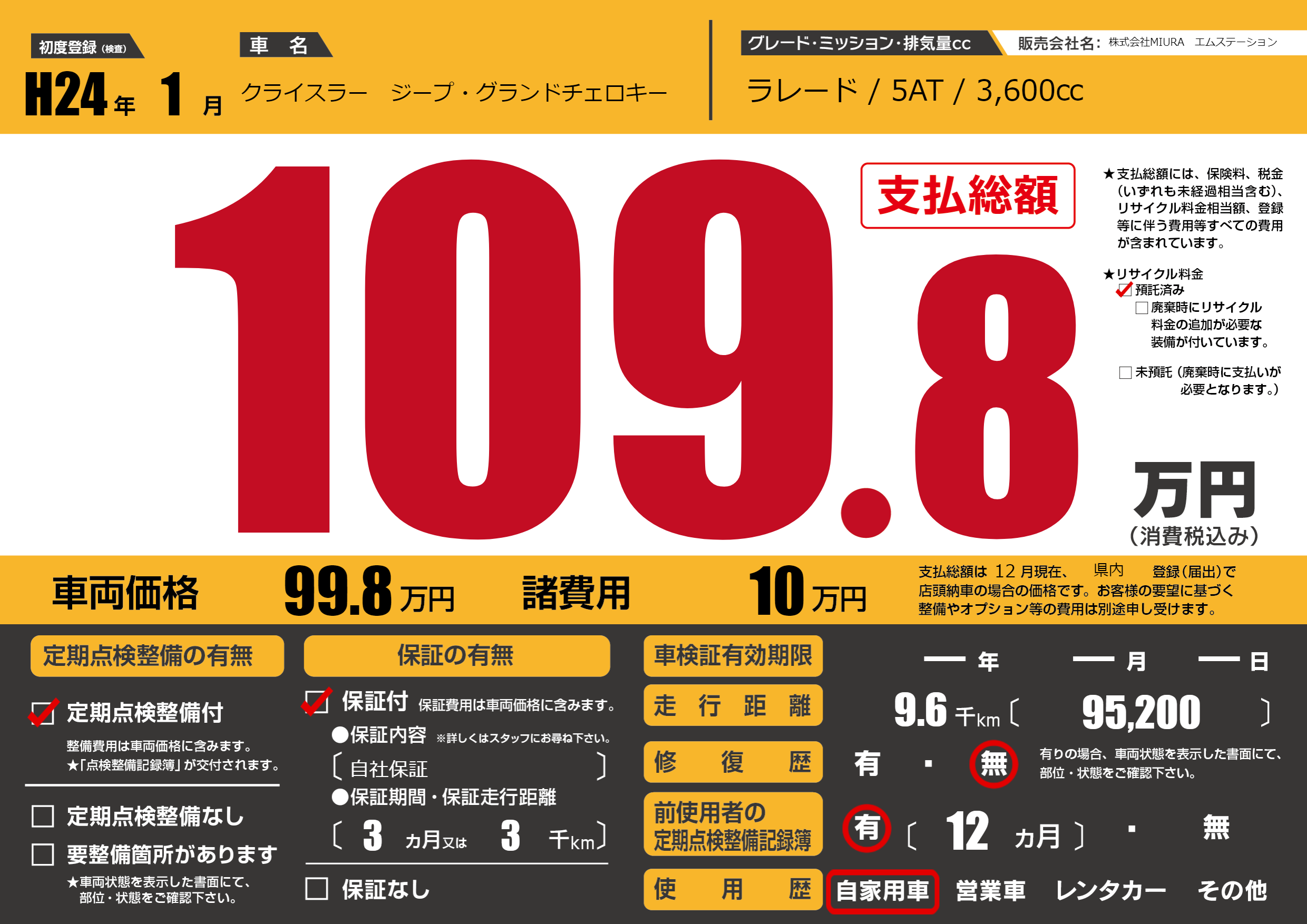 | 車名 | クライスラー ジープ・グランドチェロキー | グレード ミッション 排気量 |
