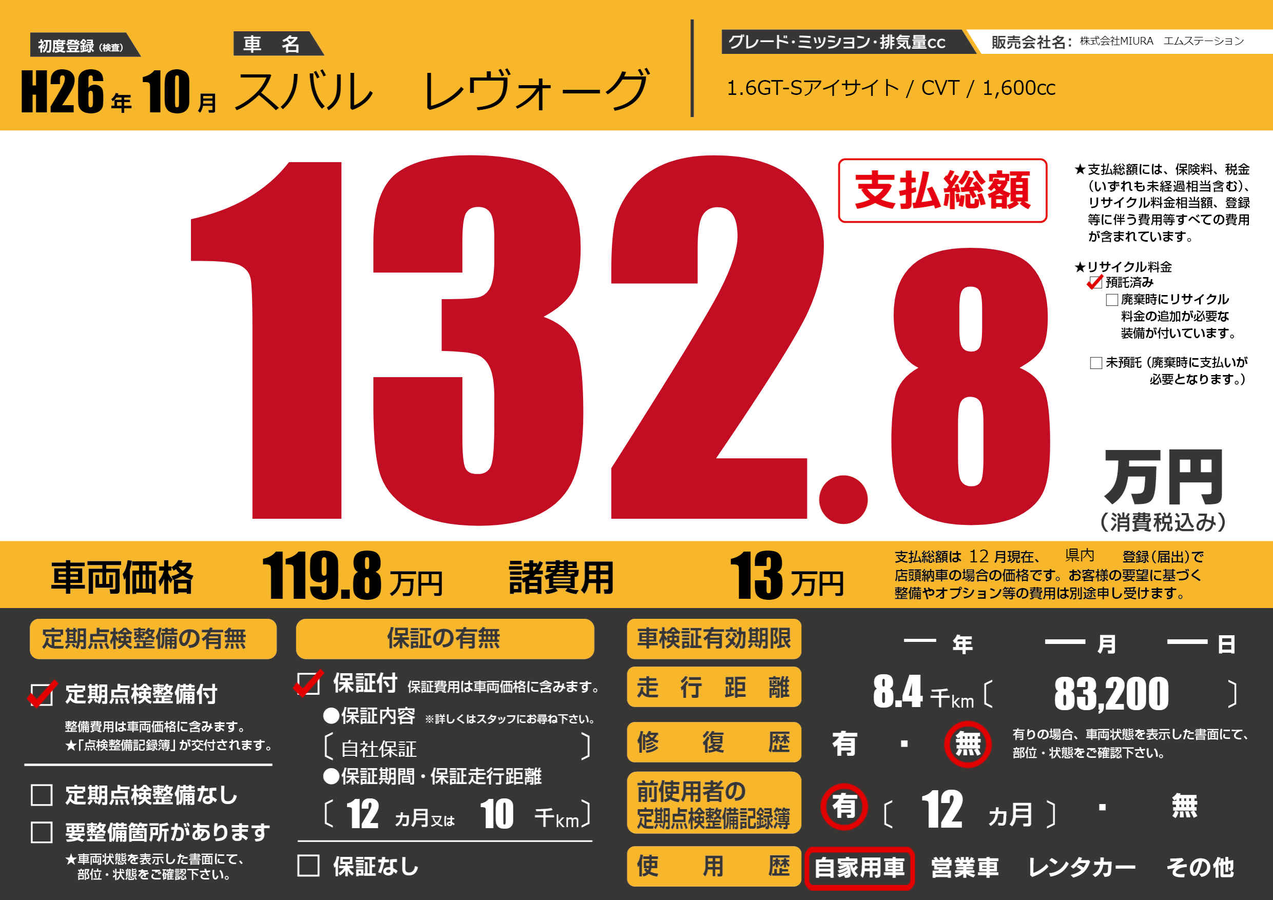| 走行キロ | 0.8万km | 初年度登録 | H26年10月 |