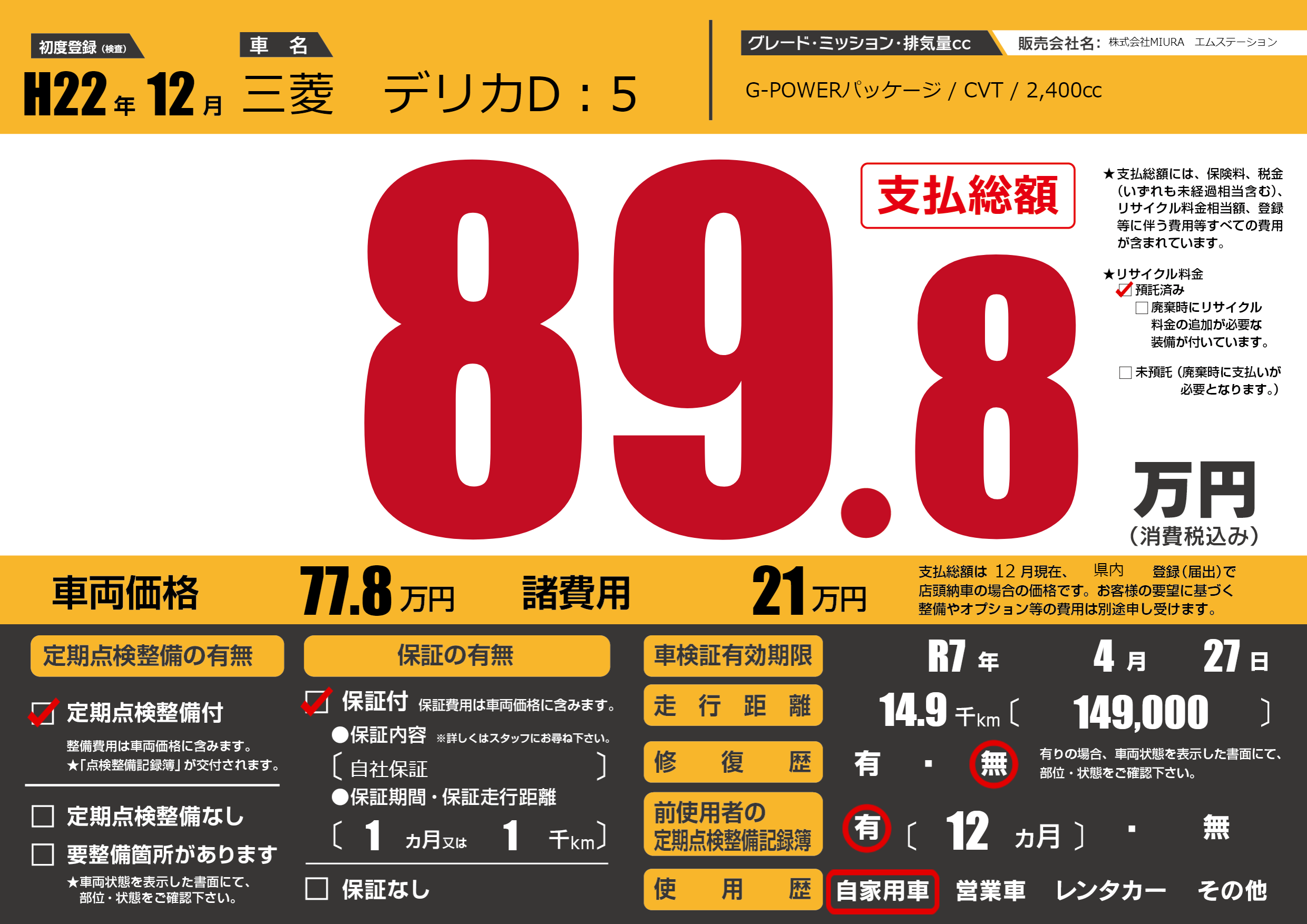 | 車検制限 | R7年 4月 27日 | ||