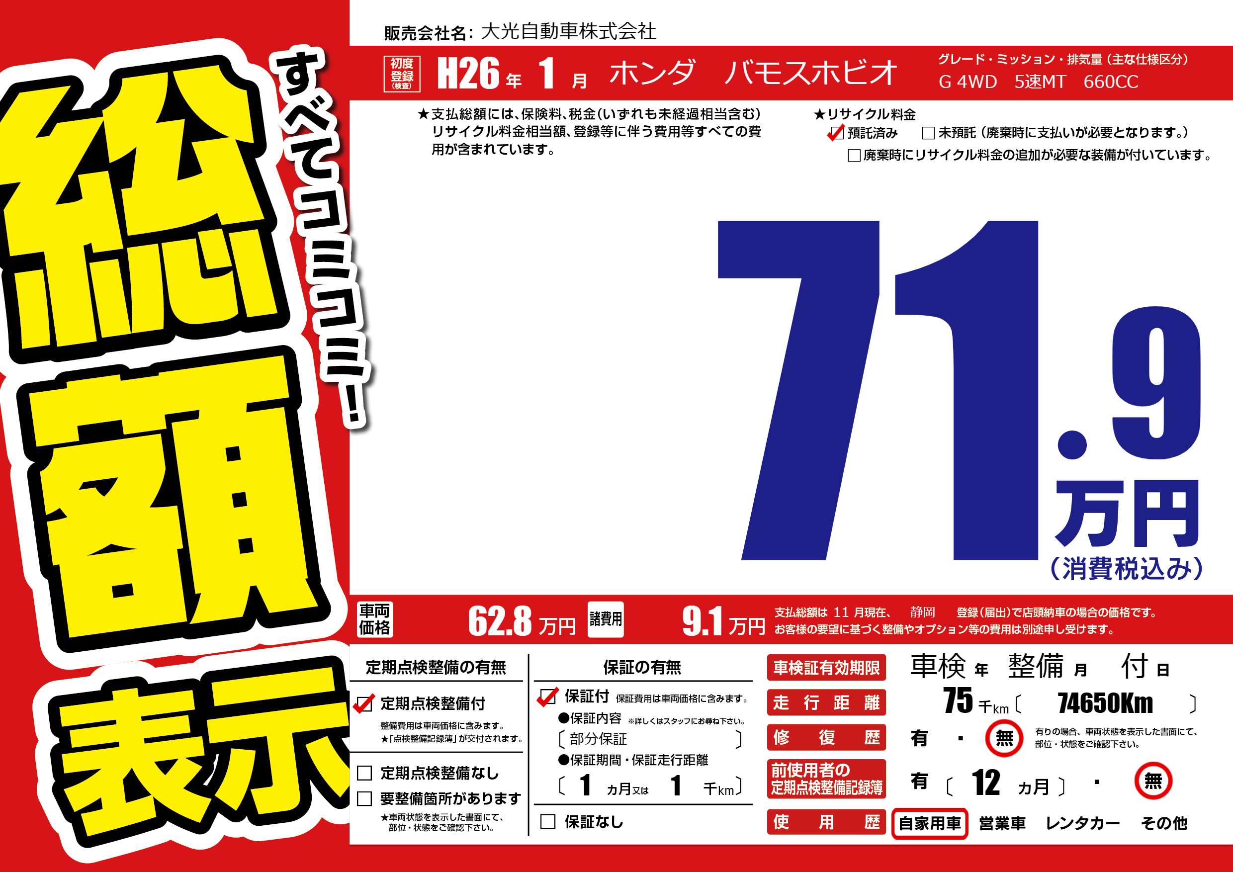 | 車名 | ホンダ バモスホビオ | グレード ミッション 排気量 |