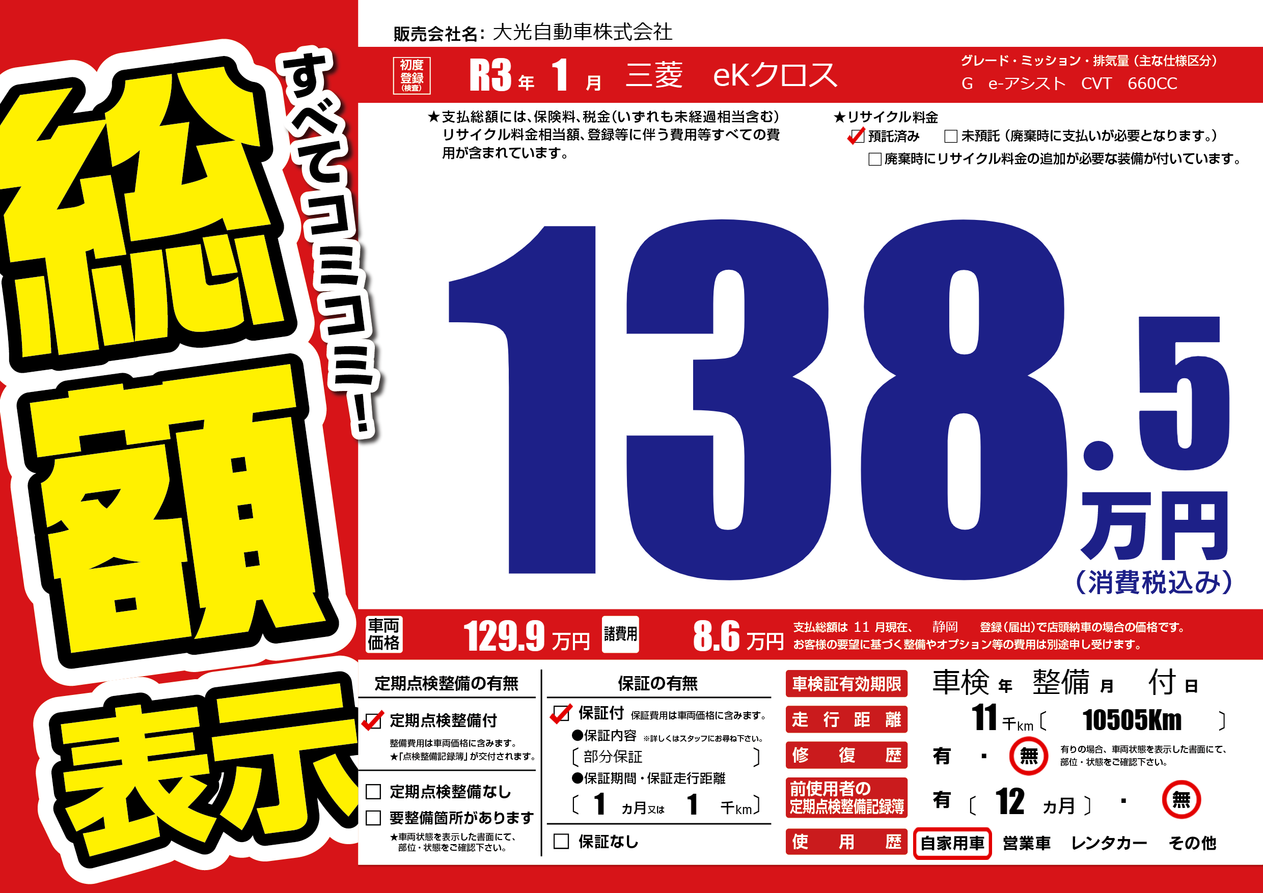 | 車名 | 三菱 eKクロス | グレード ミッション 排気量 |