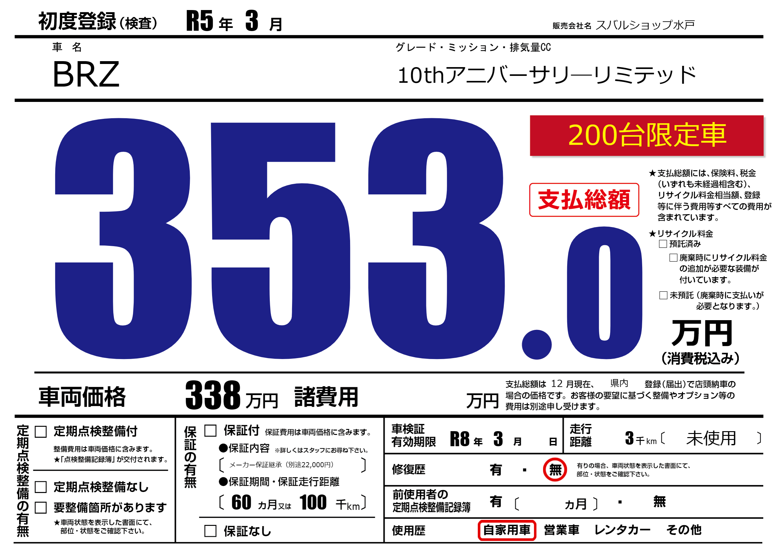 なし | 車検制限 | R8年3月---月 |