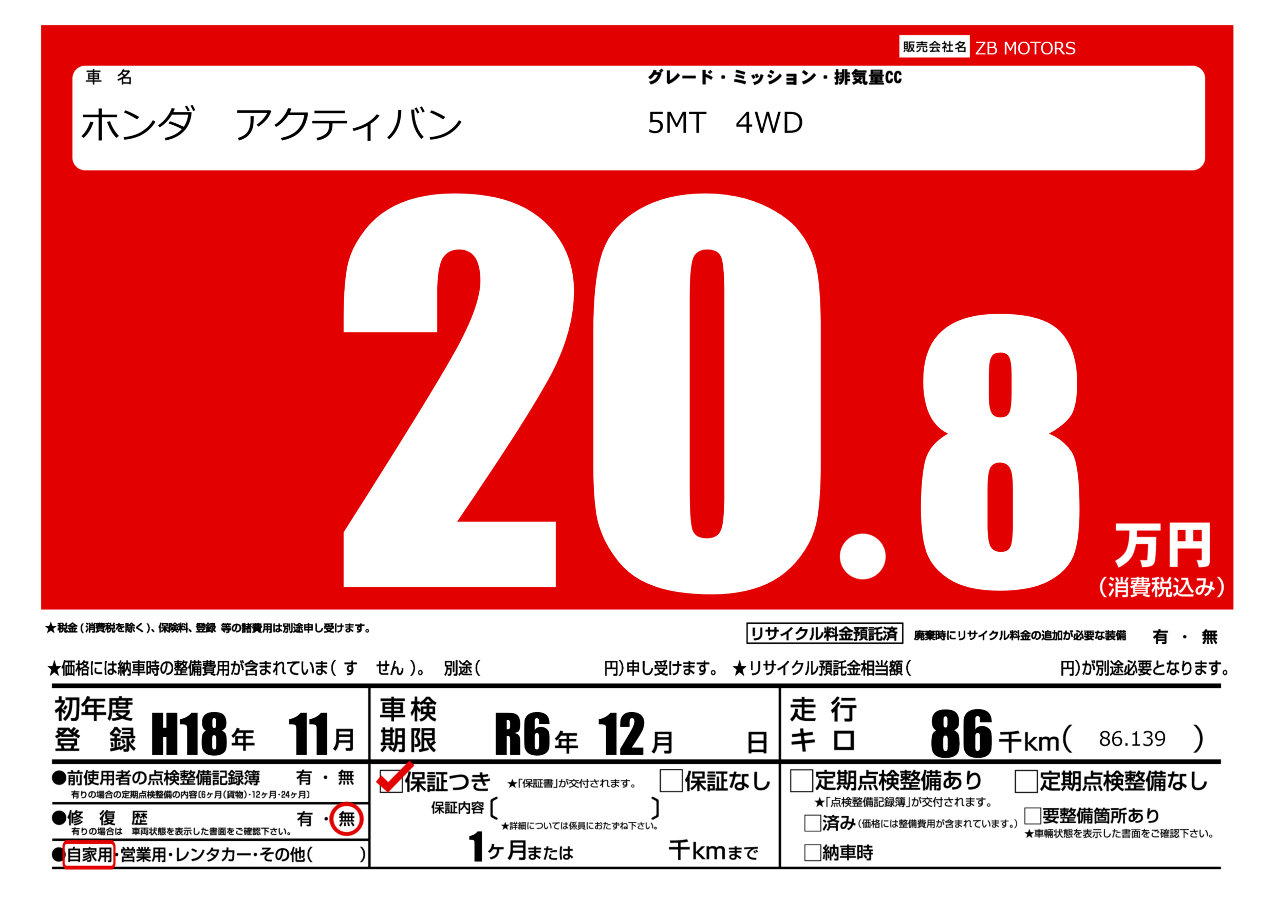 なし | 車検制限 | R6年12月---月 |
