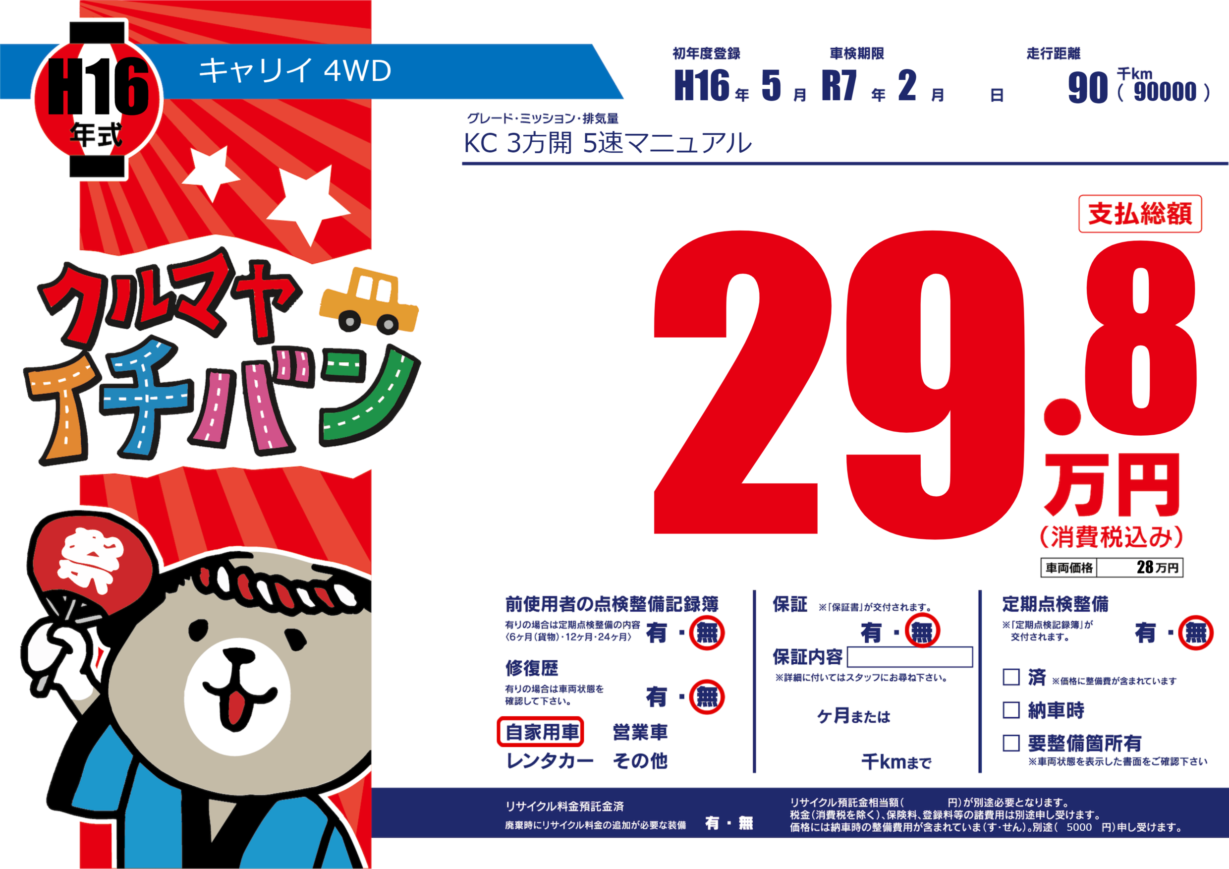| 走行キロ | 9万km | 初年度登録 | H16年5月 |