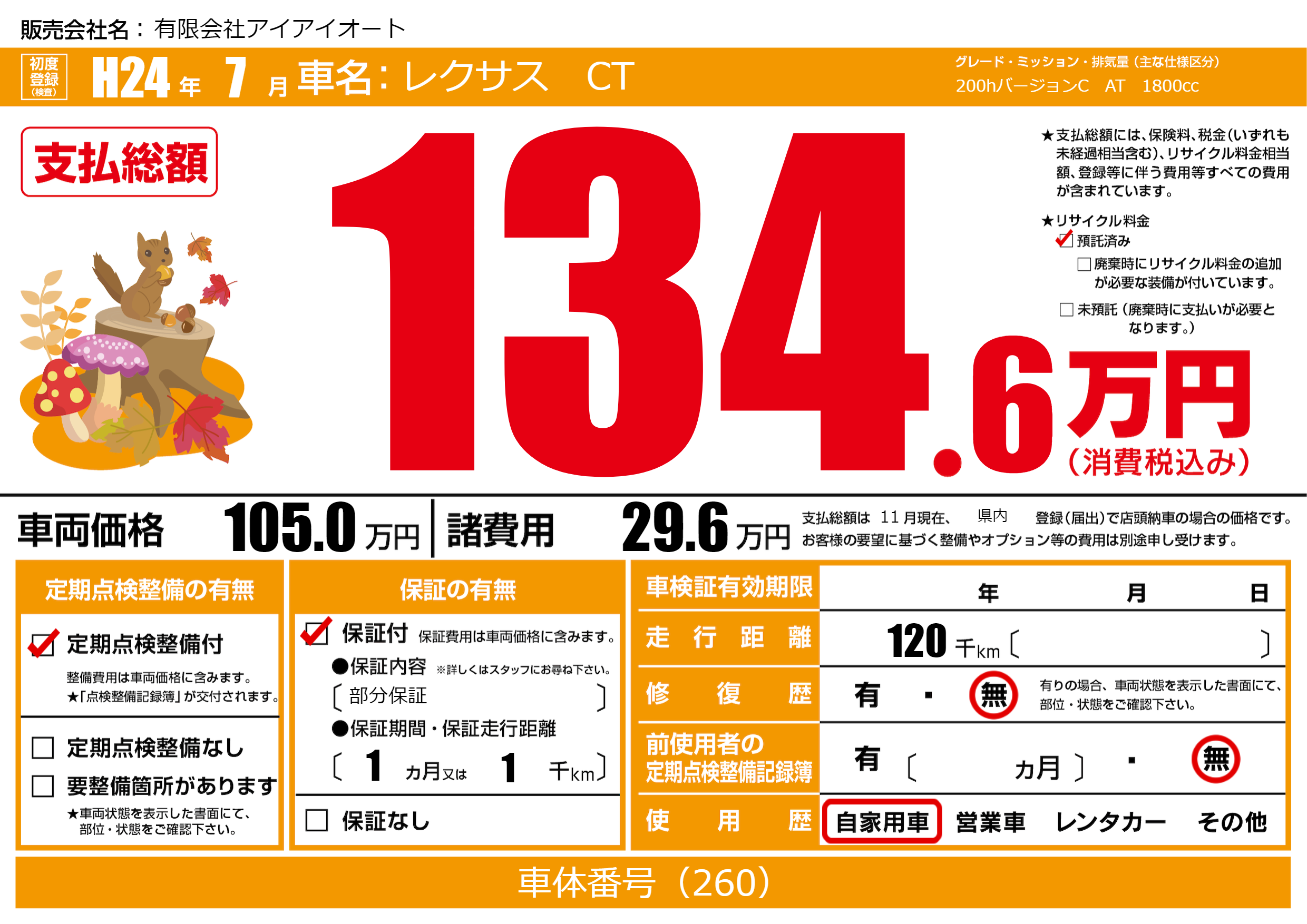 | 車名 | レクサス CT | グレード ミッション 排気量 |