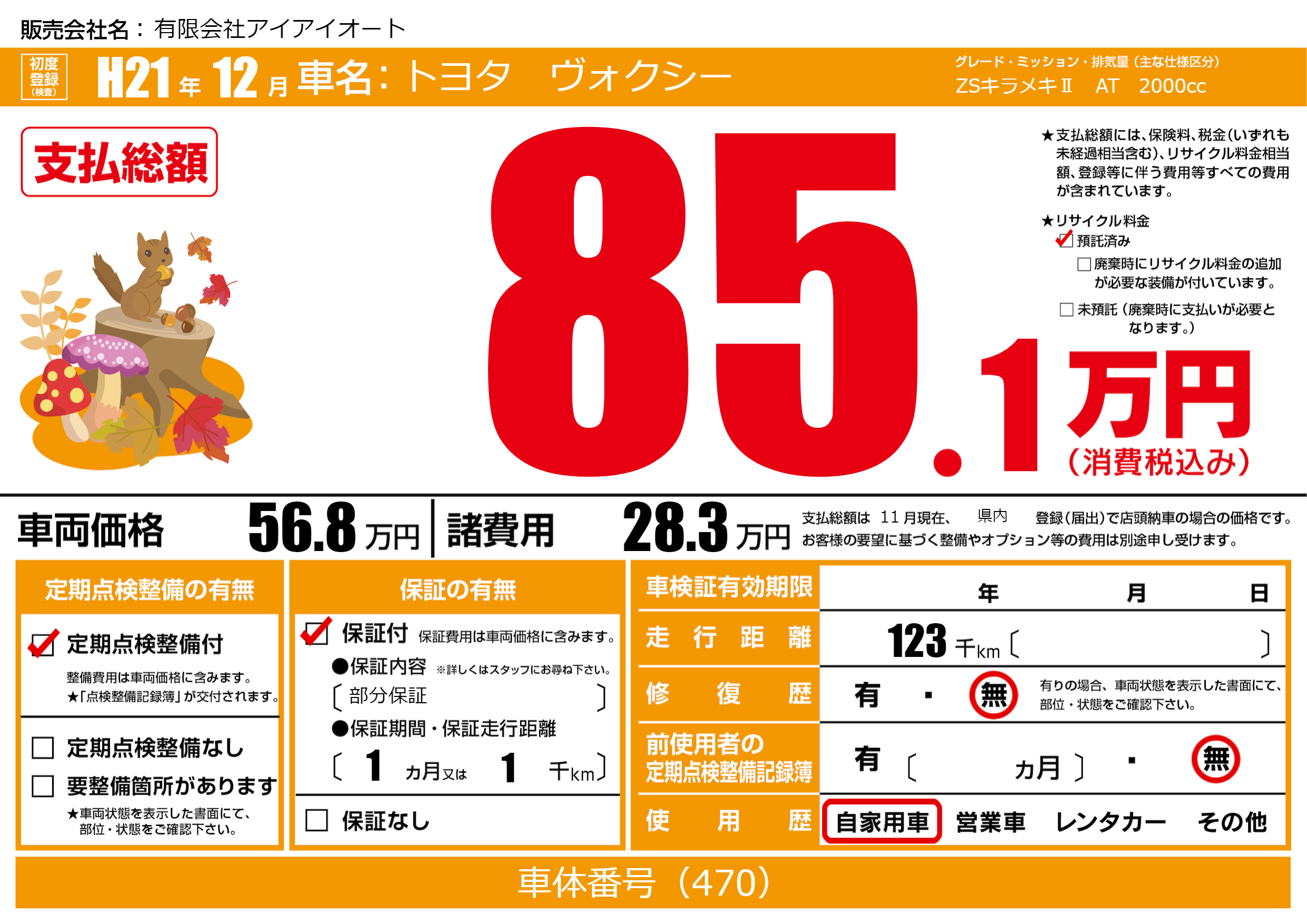 | 車名 | トヨタ ヴォクシー | グレード ミッション 排気量 |