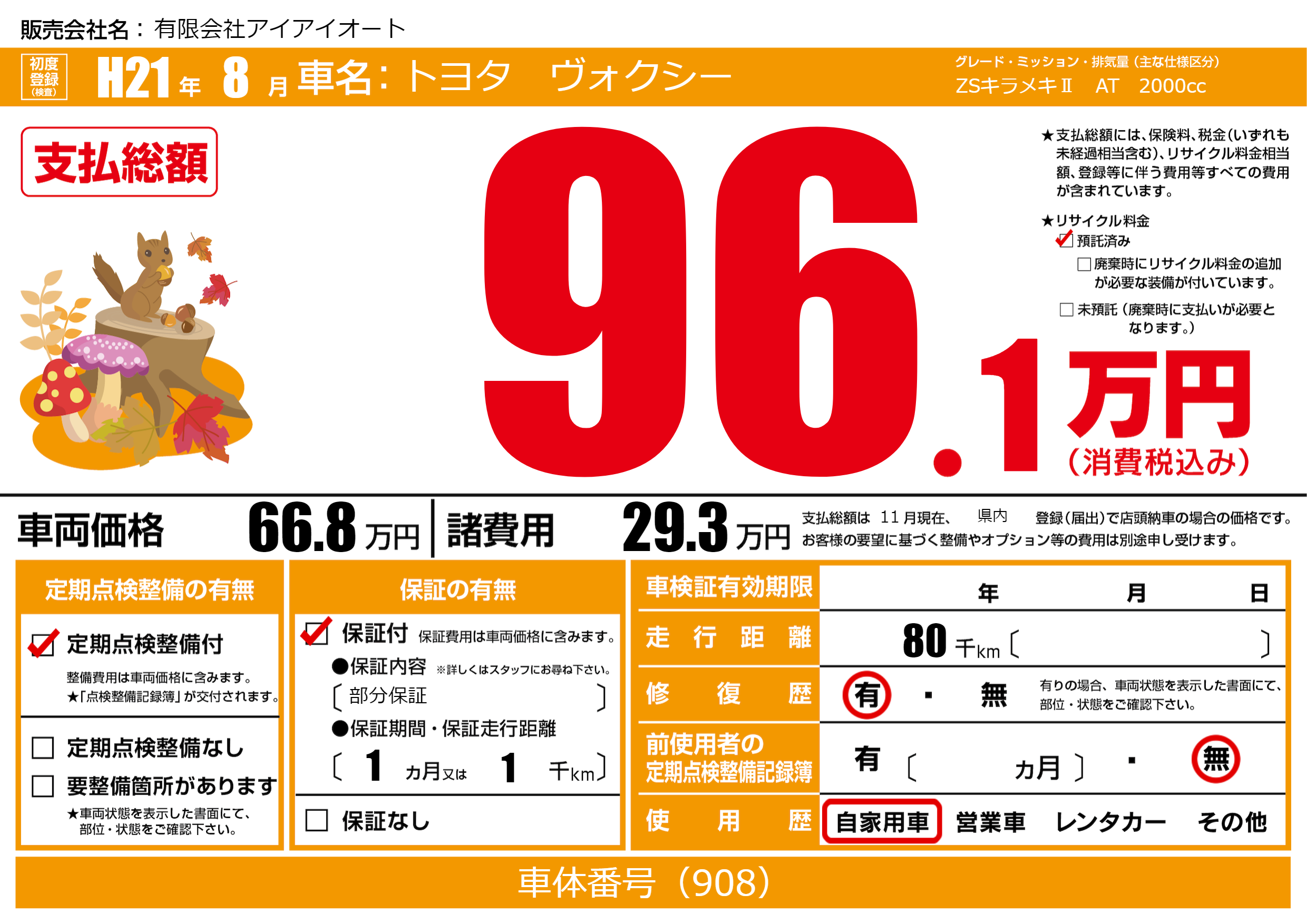 | 走行キロ | 8万km | 初年度登録 | H21年8月 |