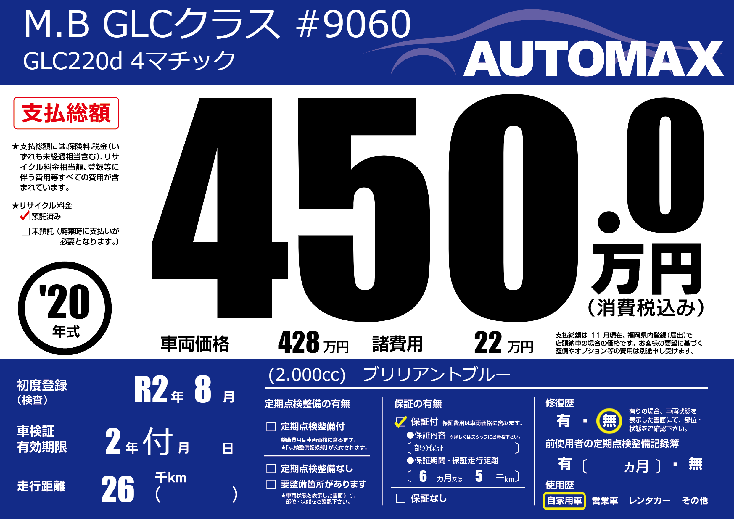 | 車名 | M.B GLCクラス #9060 | グレード ミッション 排気量 |