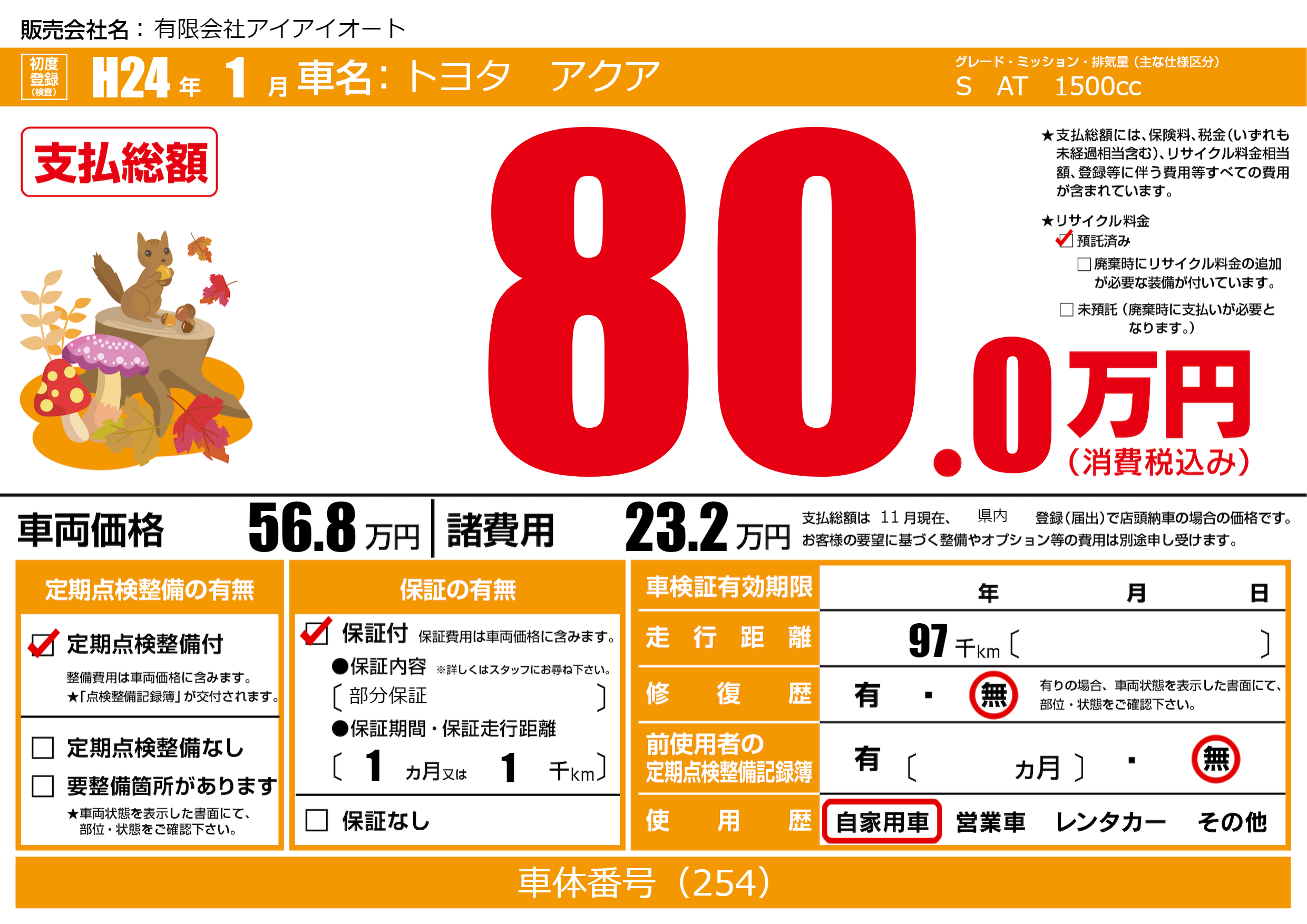 | 車名 | トヨタ アクア | グレード ミッション 排気量 |