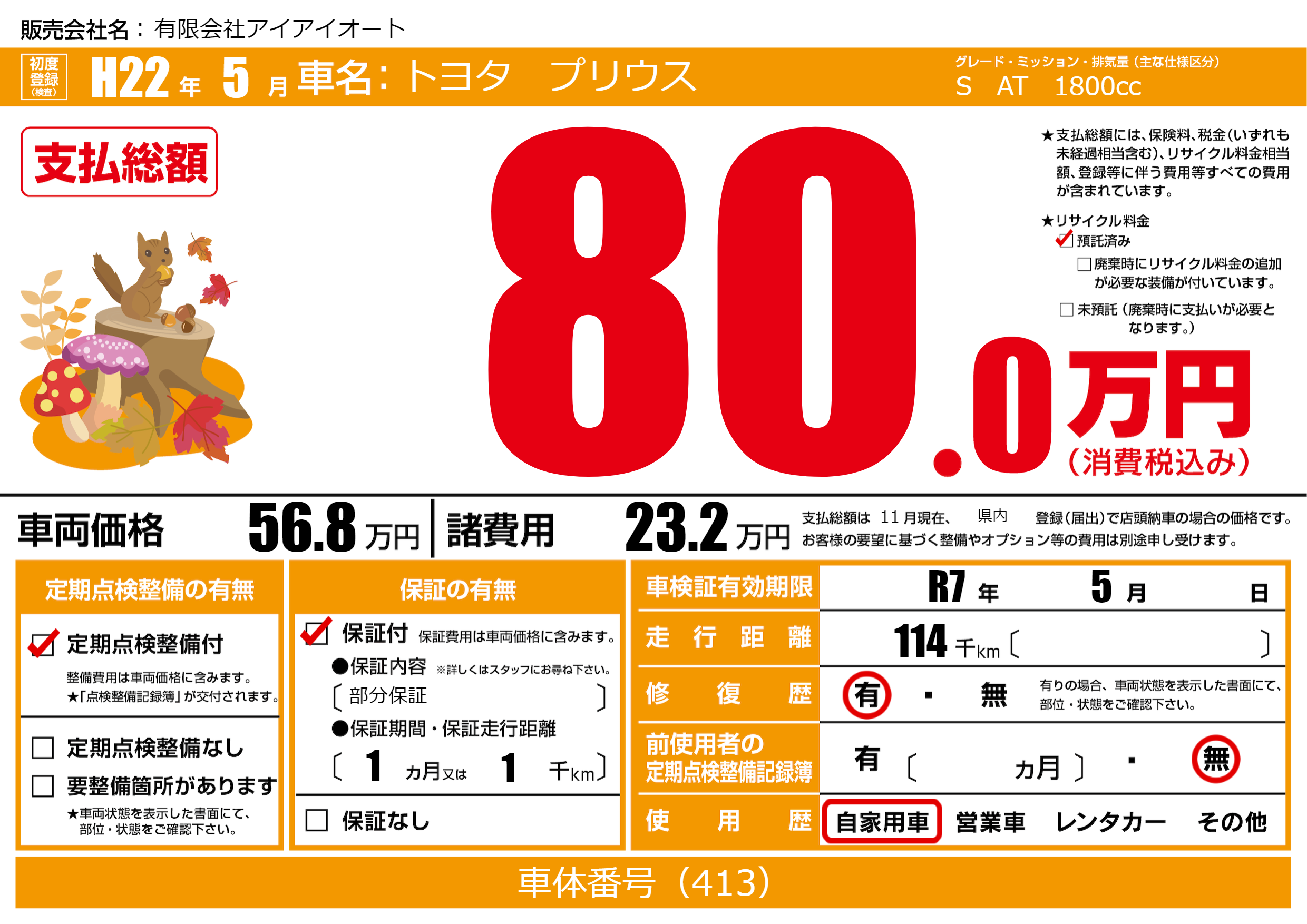 | 車名 | トヨタ プリウス | グレード ミッション 排気量 |