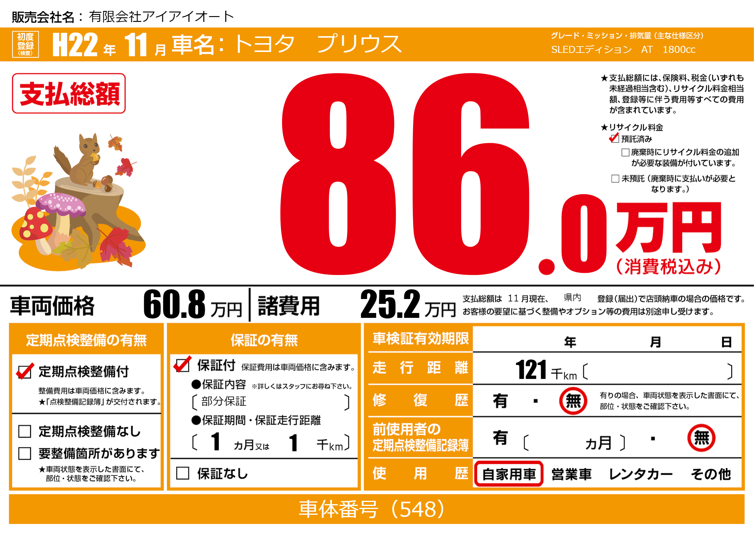 | 車名 | トヨタ プリウス | グレード ミッション 排気量 |