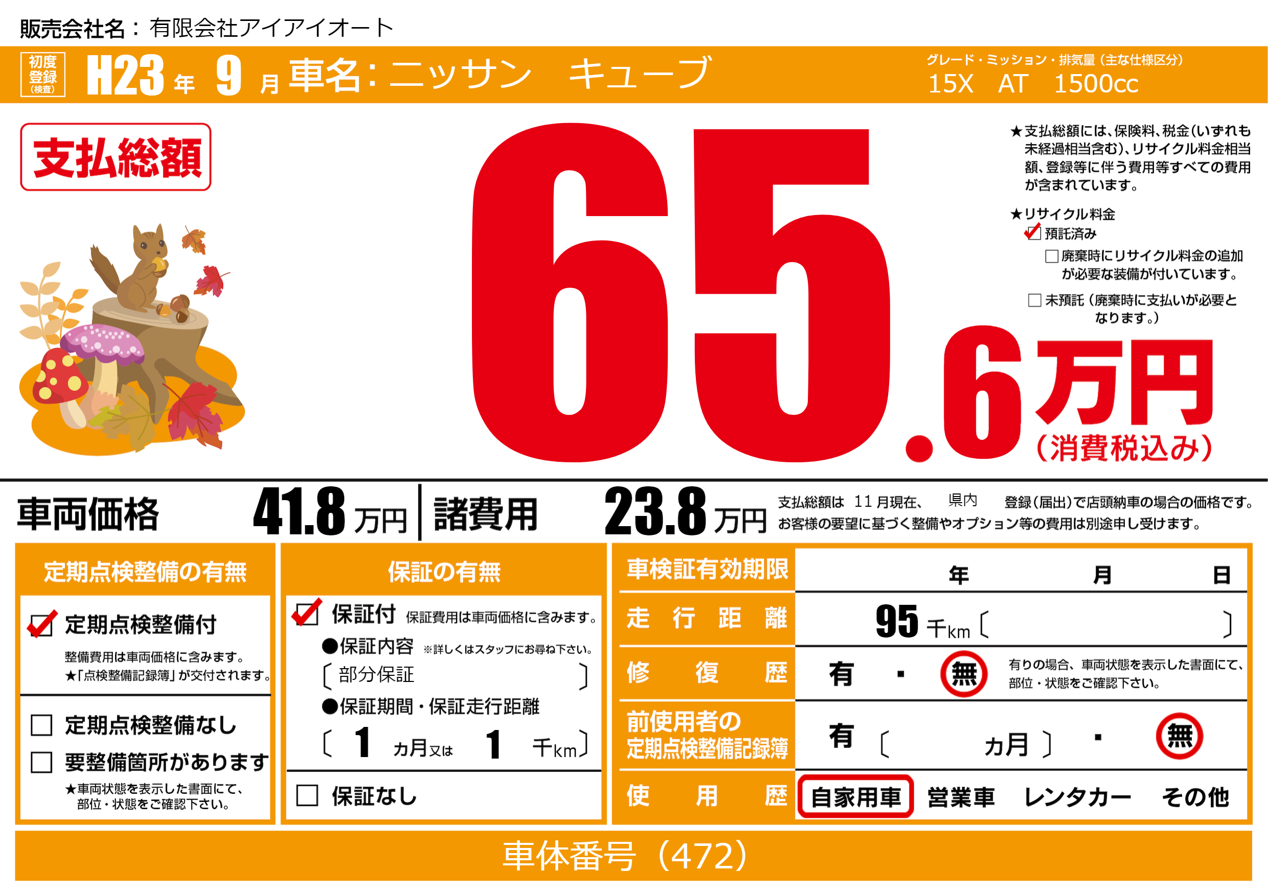 | 走行キロ | 9.5万km | 初年度登録 | H23年9月 |