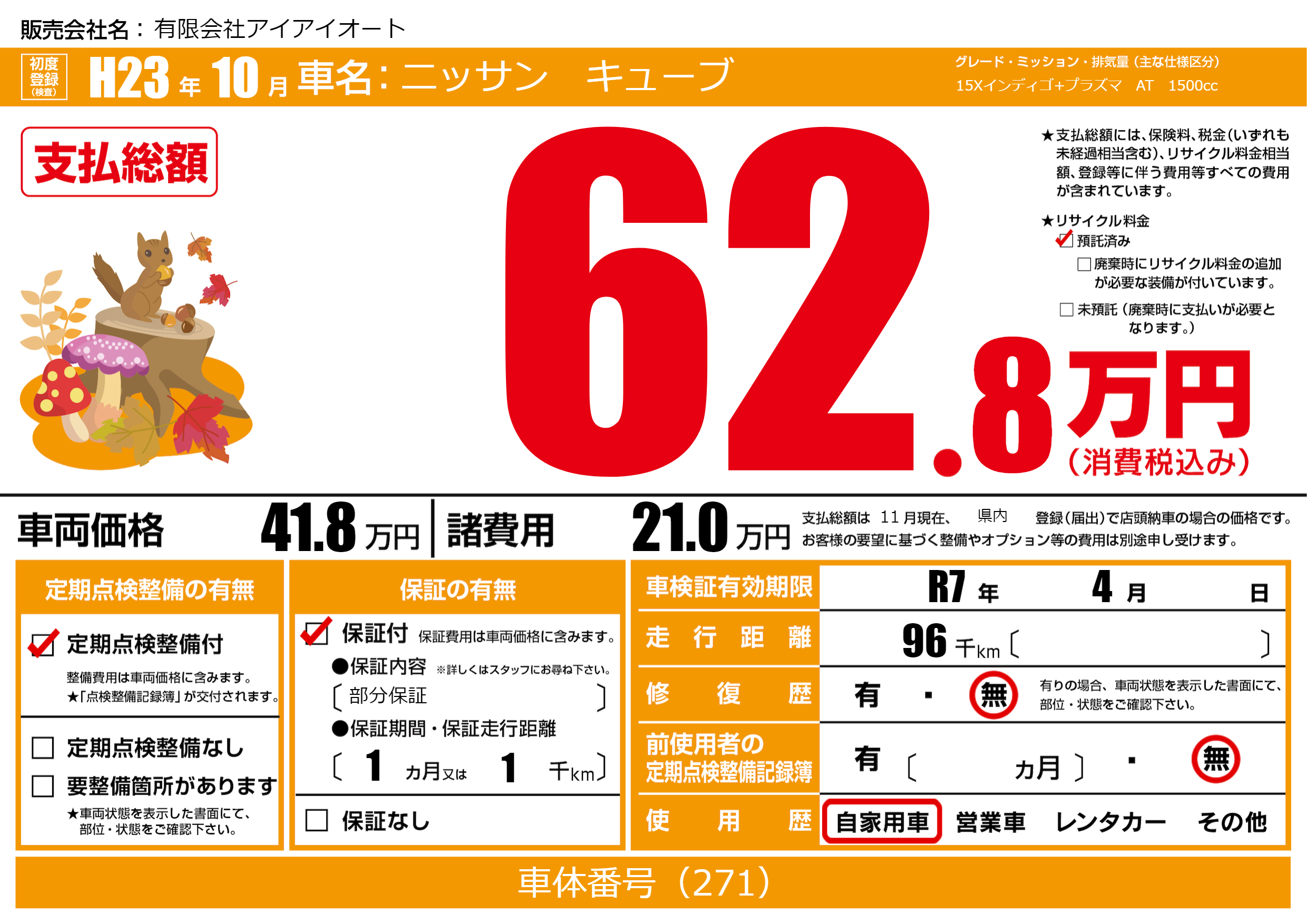 | 走行キロ | 9.6万km | 初年度登録 | H23年10月 |