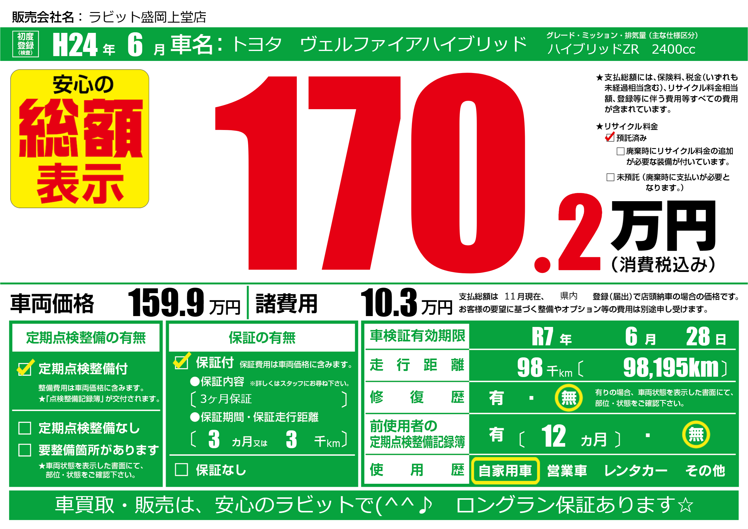 | 車名 | トヨタ ヴェルファイアハイブリッド | グレード ミッション 排気量 |