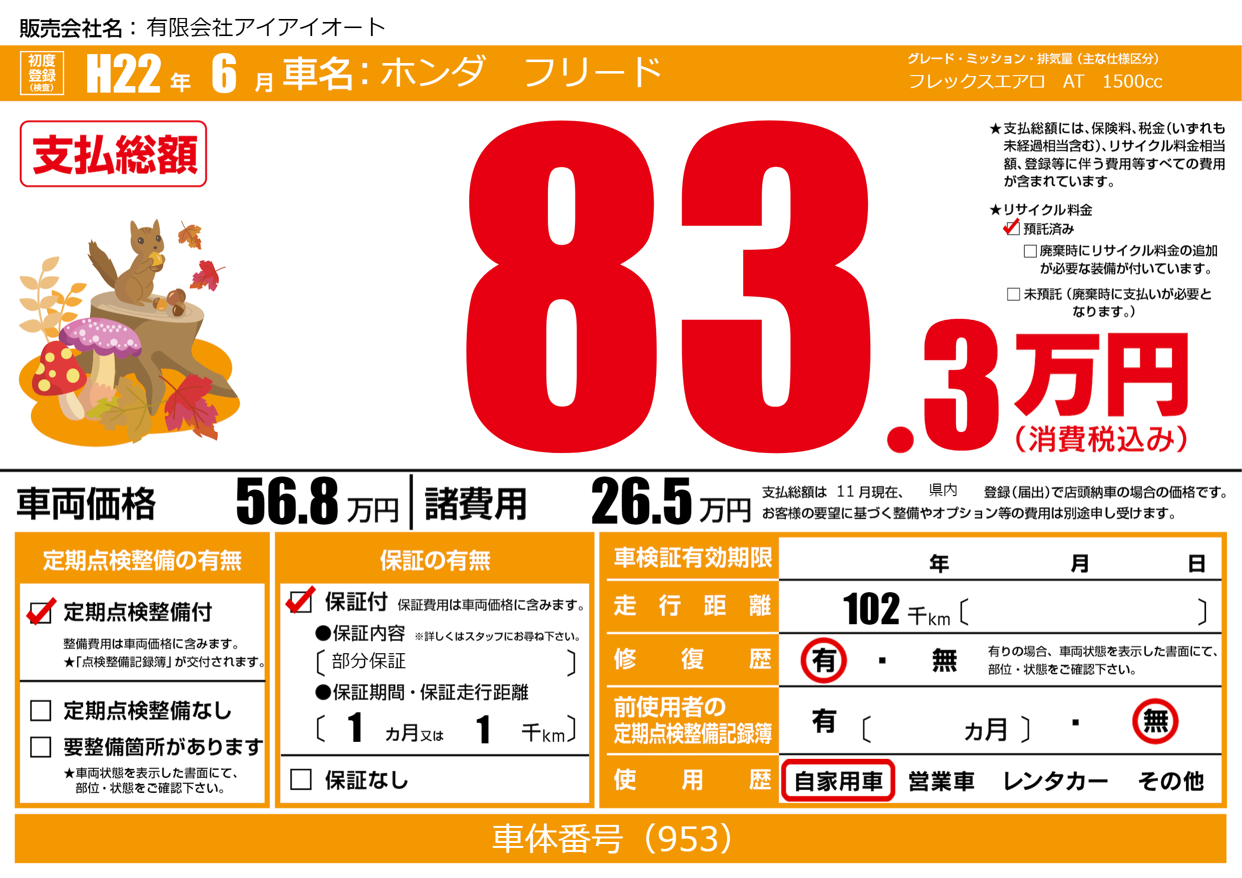 | 走行キロ | 10.2万km | 初年度登録 | H22年6月 |