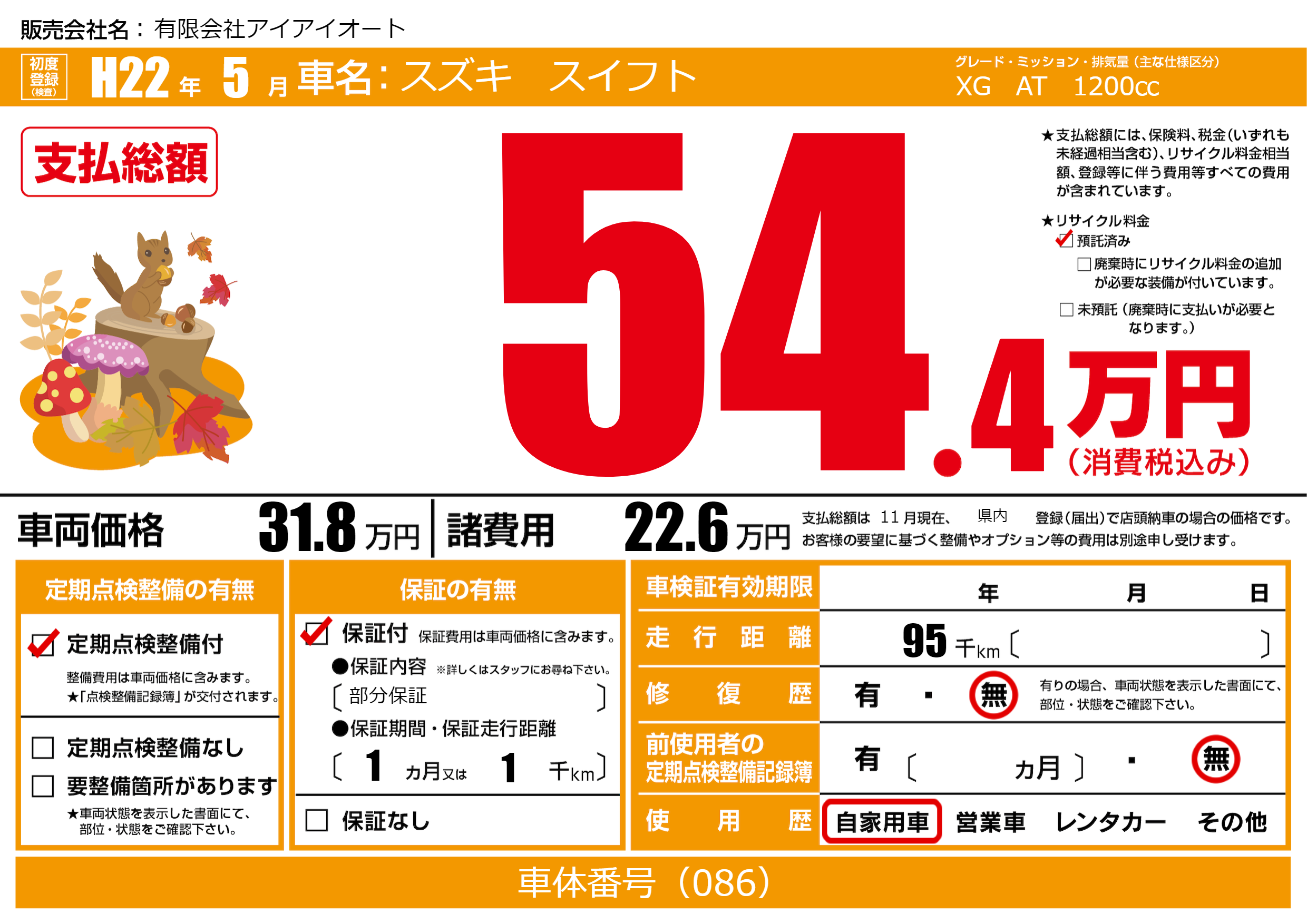| 車名 | スズキ スイフト | グレード ミッション 排気量 |