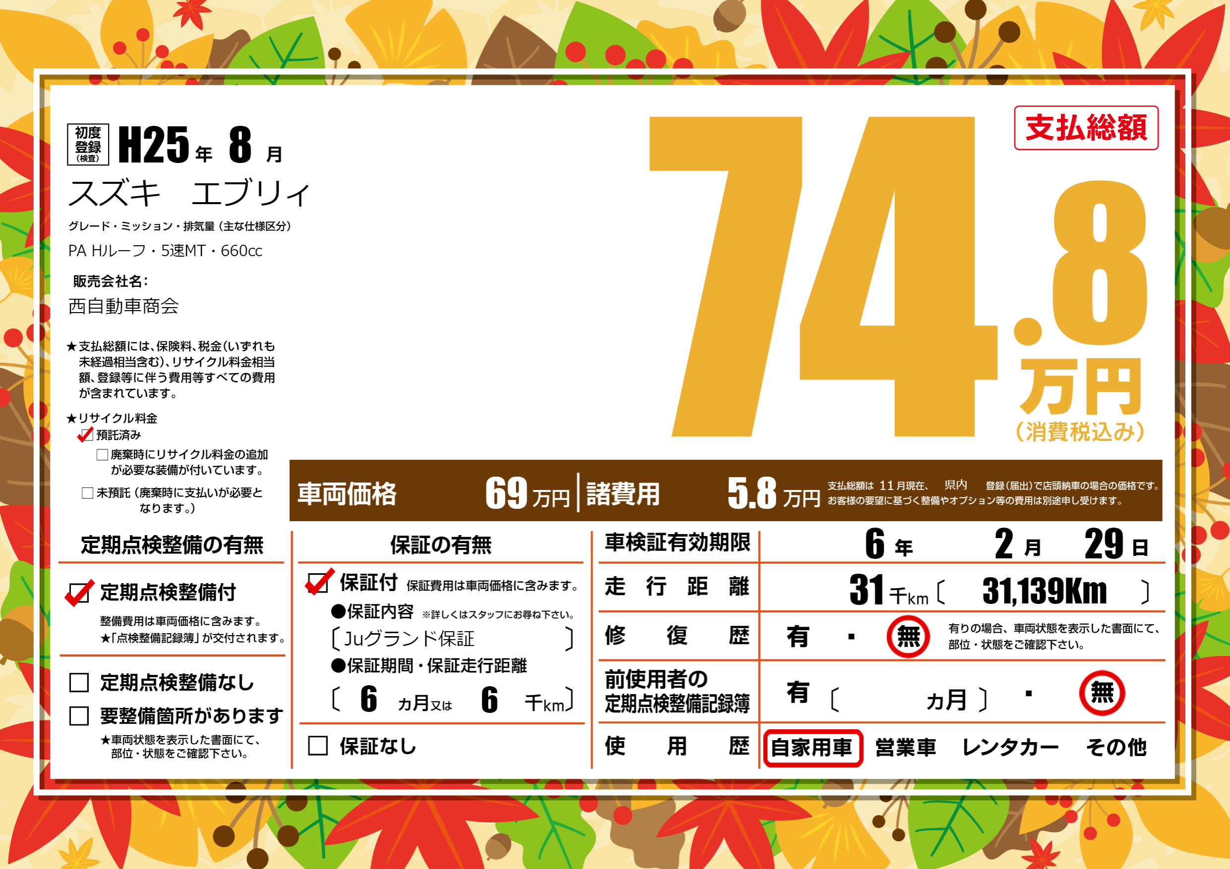 | 車名 | スズキ エブリィ | グレード ミッション 排気量 |