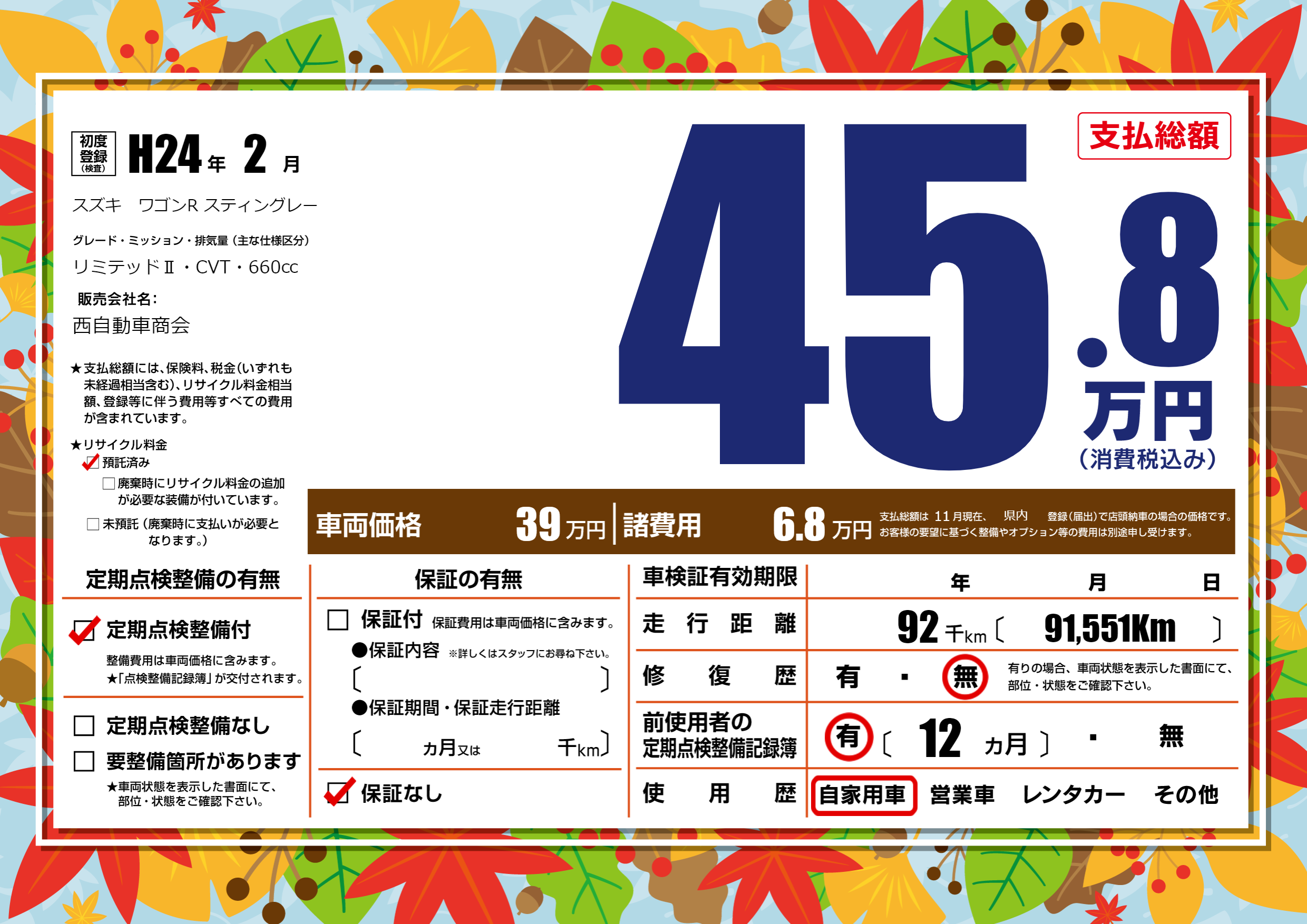 | 走行キロ | 9.2万km | 初年度登録 | H24年2月 |