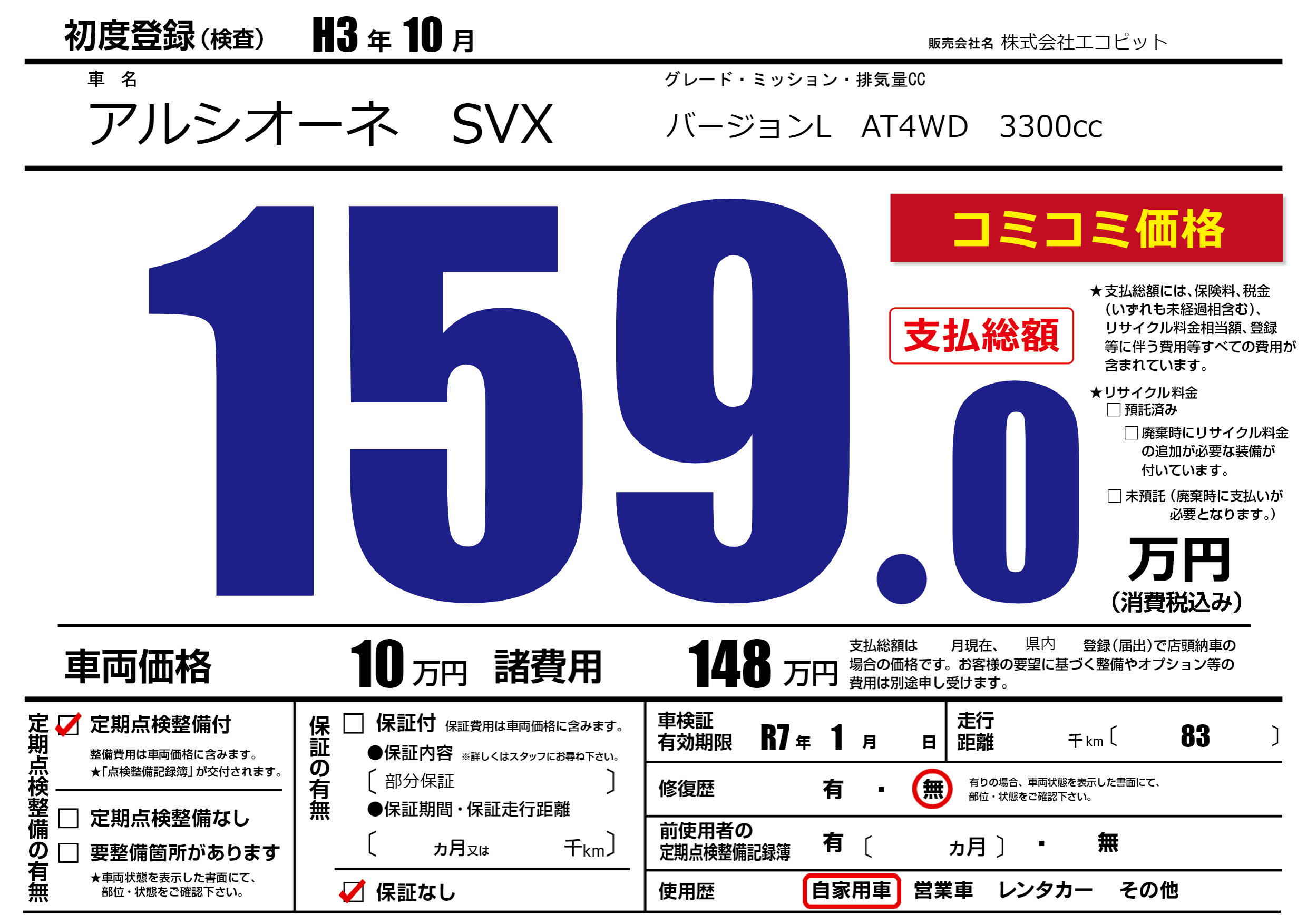 | 車名 | アルシオーネ SVX | グレード ミッション 排気量 |