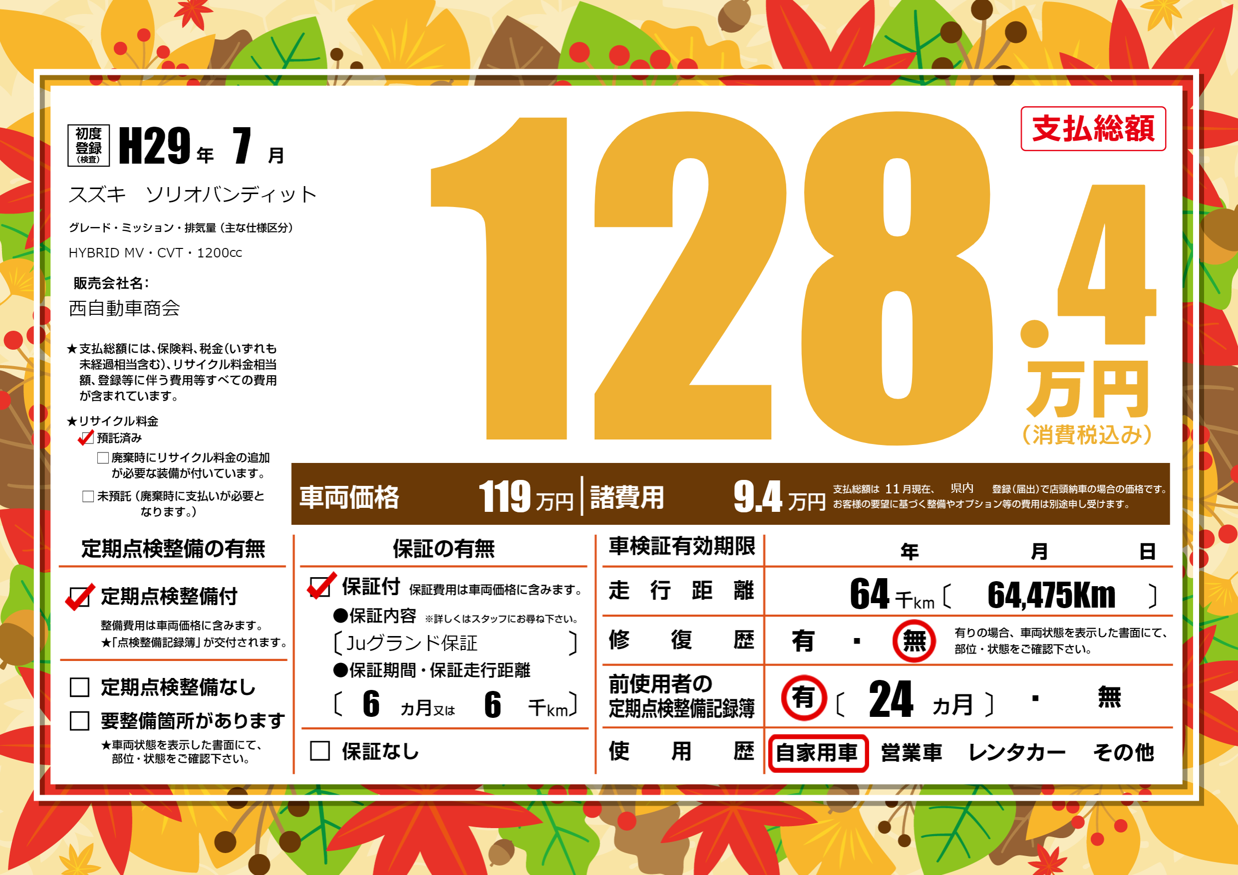 | 車名 | スズキ ソリオバンディット | グレード ミッション 排気量 |