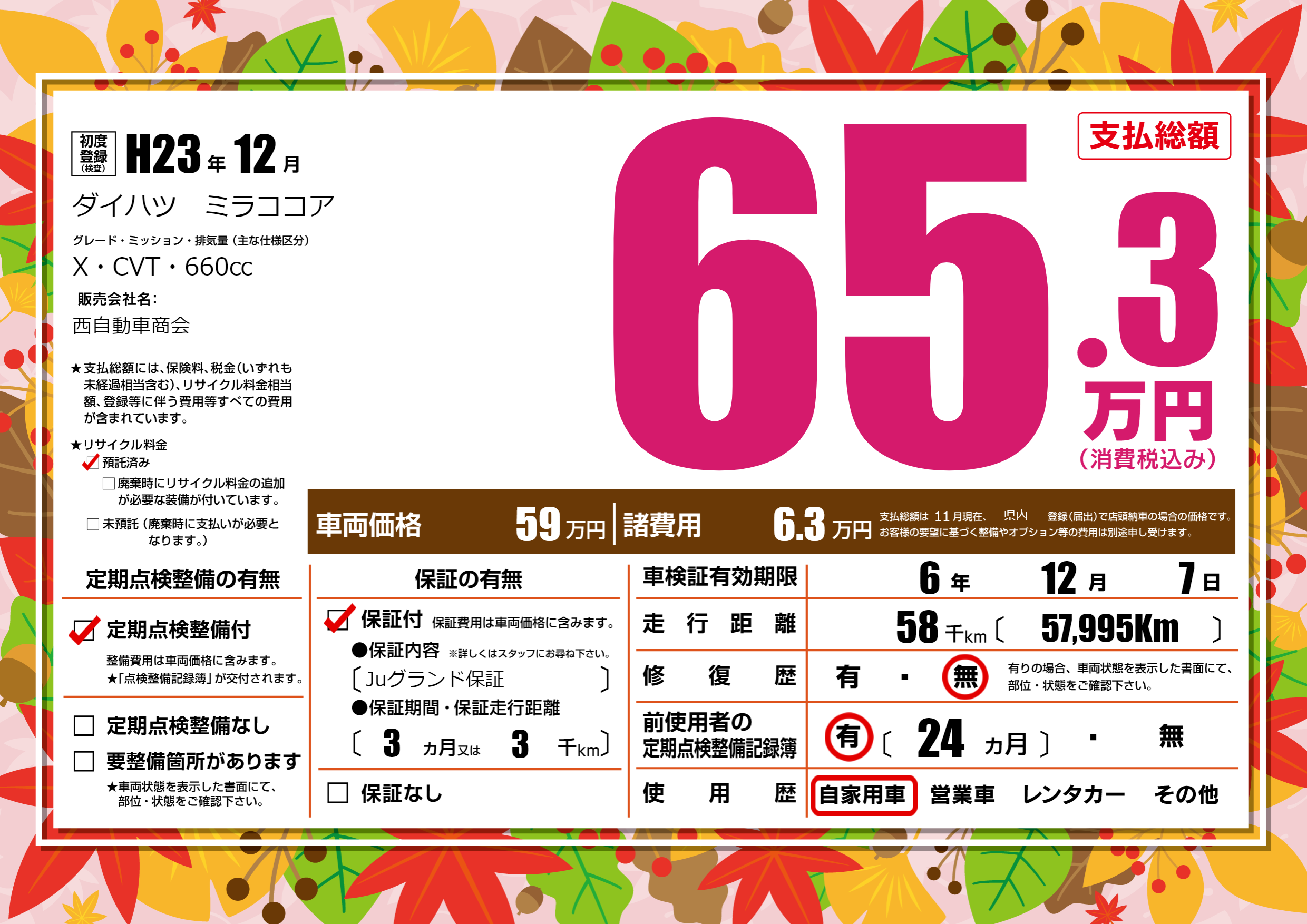 保証付き 保証内容(Juグランド保証) 3ヶ月または3千km |