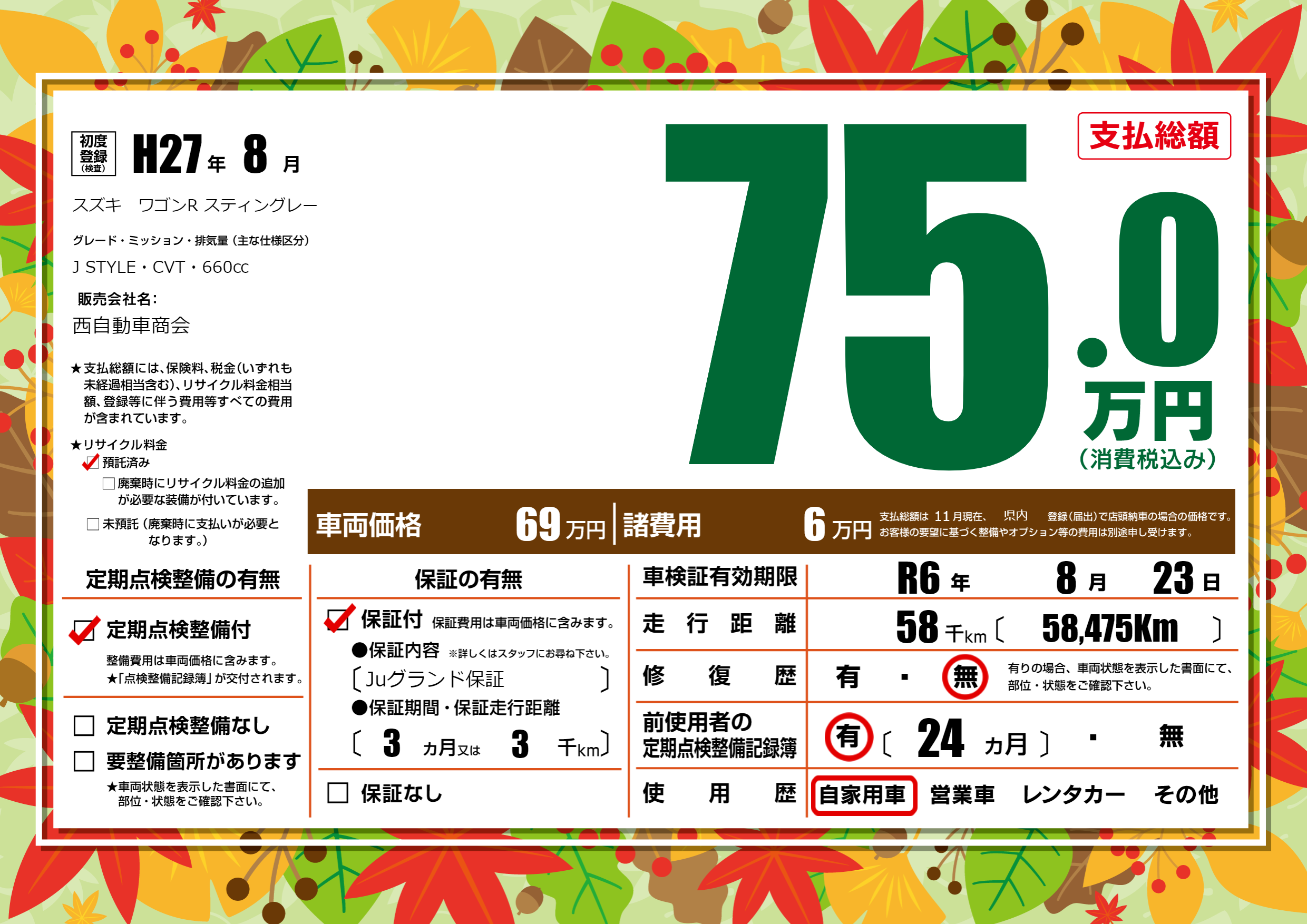 | 車名 | スズキ ワゴンR スティングレー | グレード ミッション 排気量 |