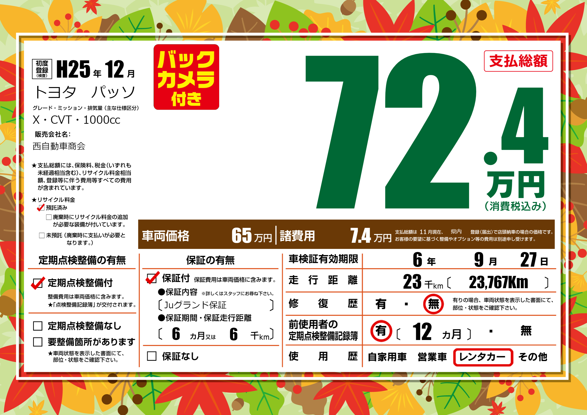 | 車名 | トヨタ パッソ | グレード ミッション 排気量 |